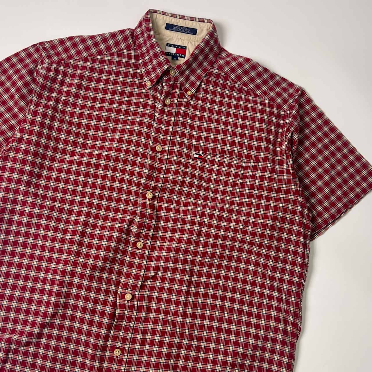 90s TOMMY HILFIGER トミーヒルフィガー チェック BD ボタンダウン オックスフォード 半袖シャツ M/レッド メンズ ビンテージ