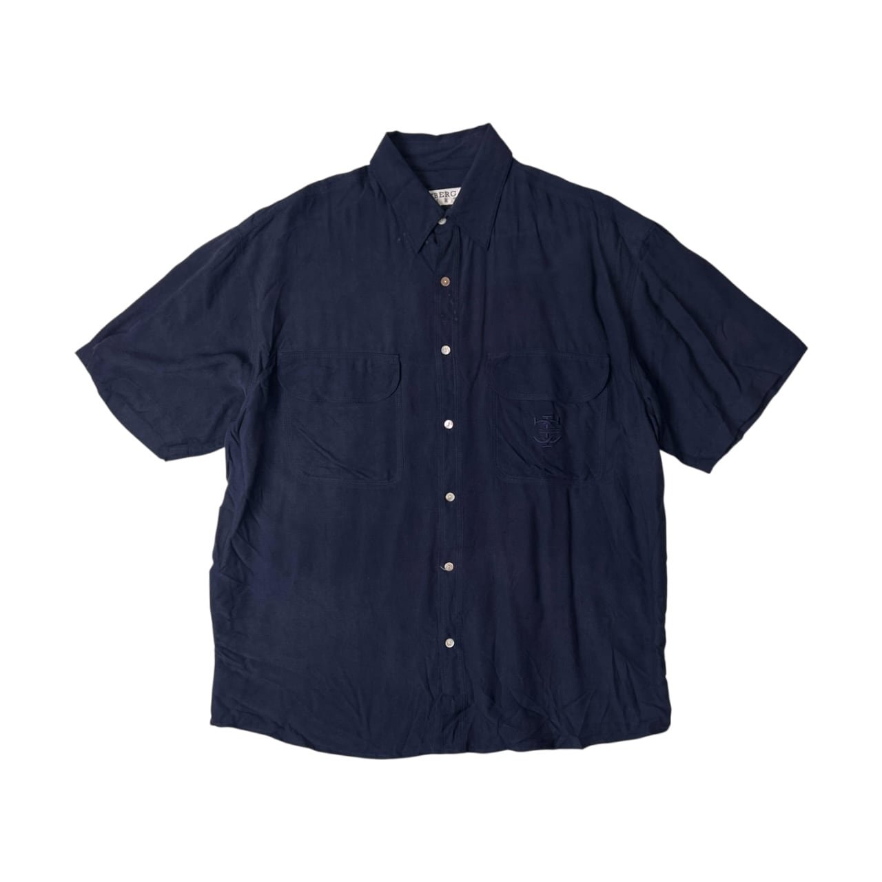ICEBERG アイスバーグ シルク100% ロゴ刺繍 半袖ワークシャツ L/ネイビー