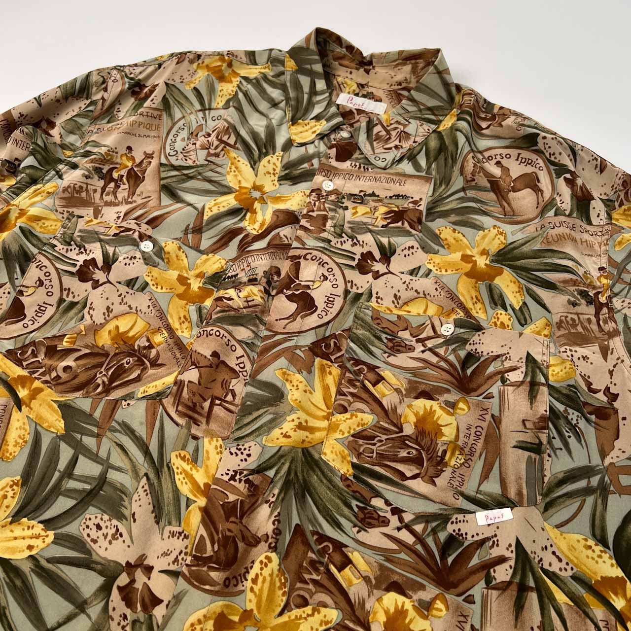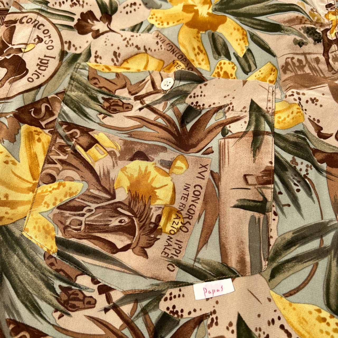 PAPAS パパス 花柄&ホース柄 総柄 シルク100% 長袖シャツ サイズ L /グリーン系/絹100%