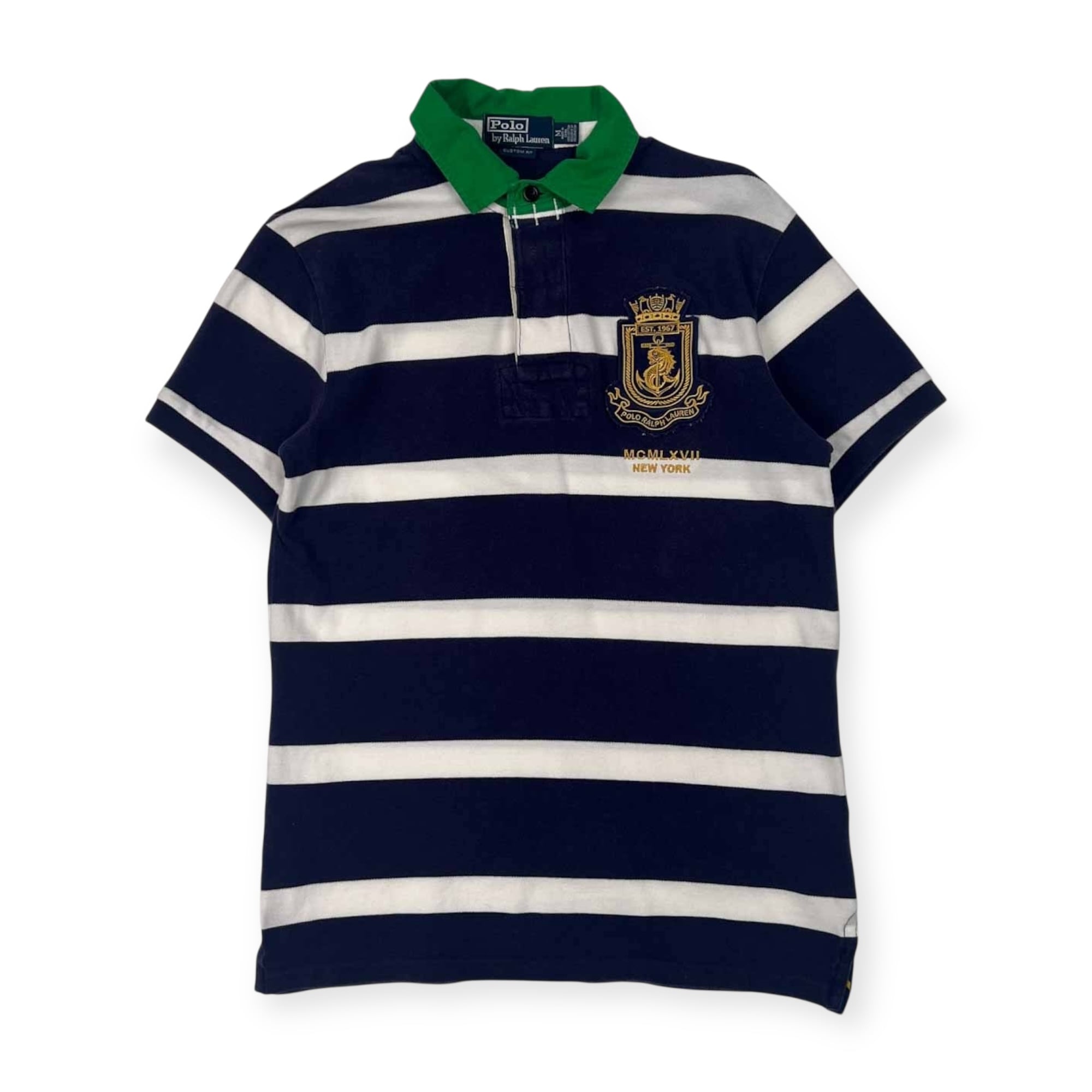 90s 00s Polo by Ralph Lauren ラルフローレン CUSTOM FIT ボーダー エンブレム 鹿の子 半袖 ラガーシャツ ポロシャツ M/ネイビー×ホワイト メンズ オールド
