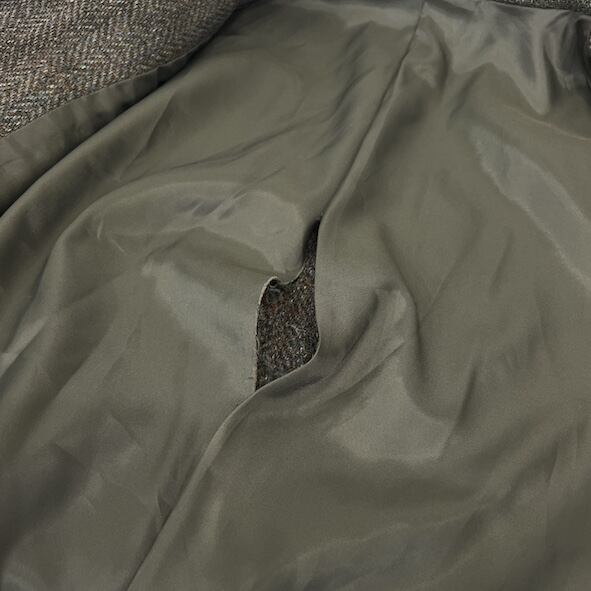 裏地に個人ネーム刺繍入りです。裏地に裂けところどころダメージがあります。コンデションについての詳細は画像をご参照ください。