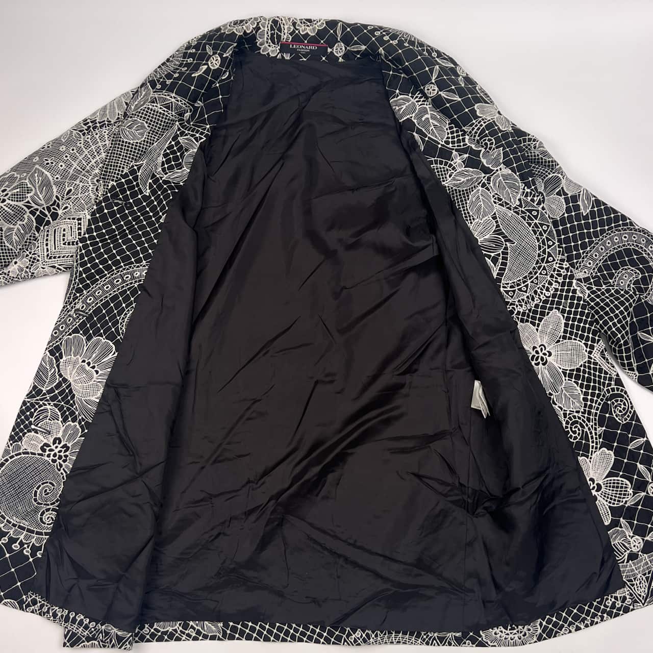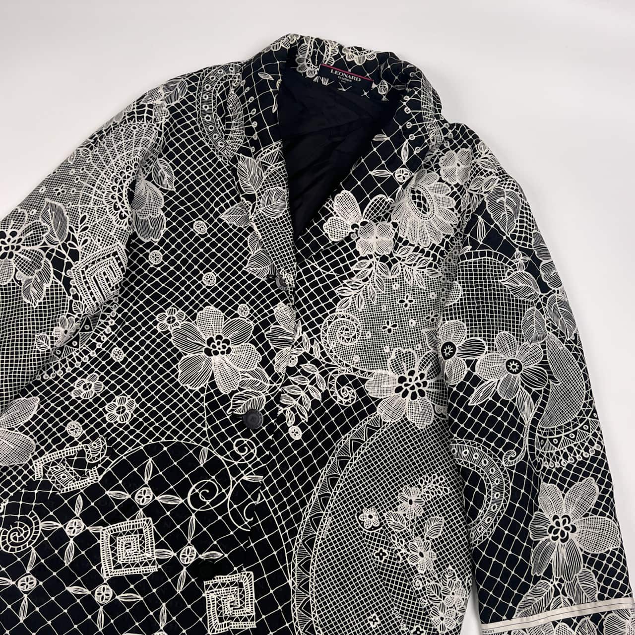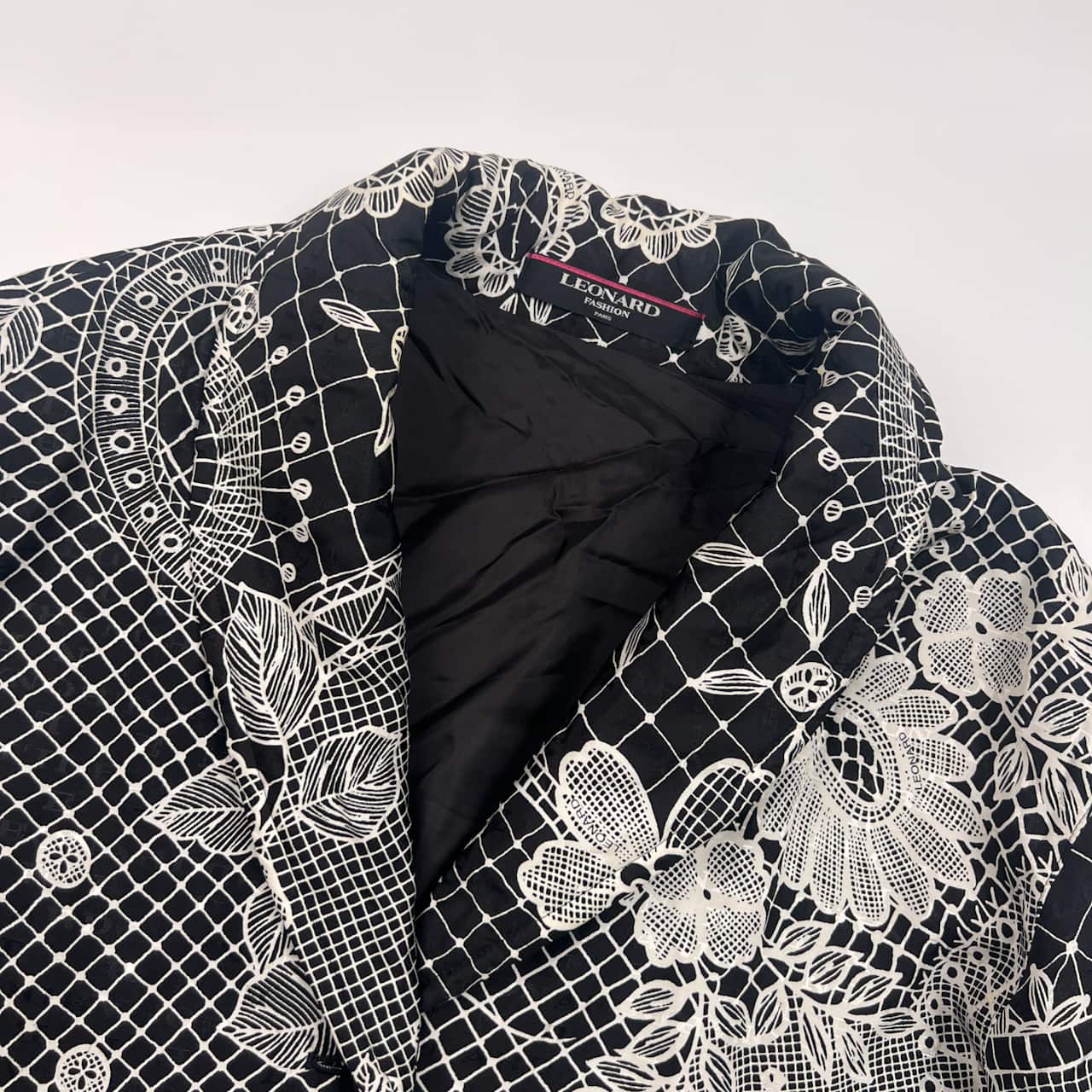 シルク100% LEONARD FASHION レオナール 花柄 総柄 中綿 ショールカラー ジャケット /11R ブラック×ホワイト レディース