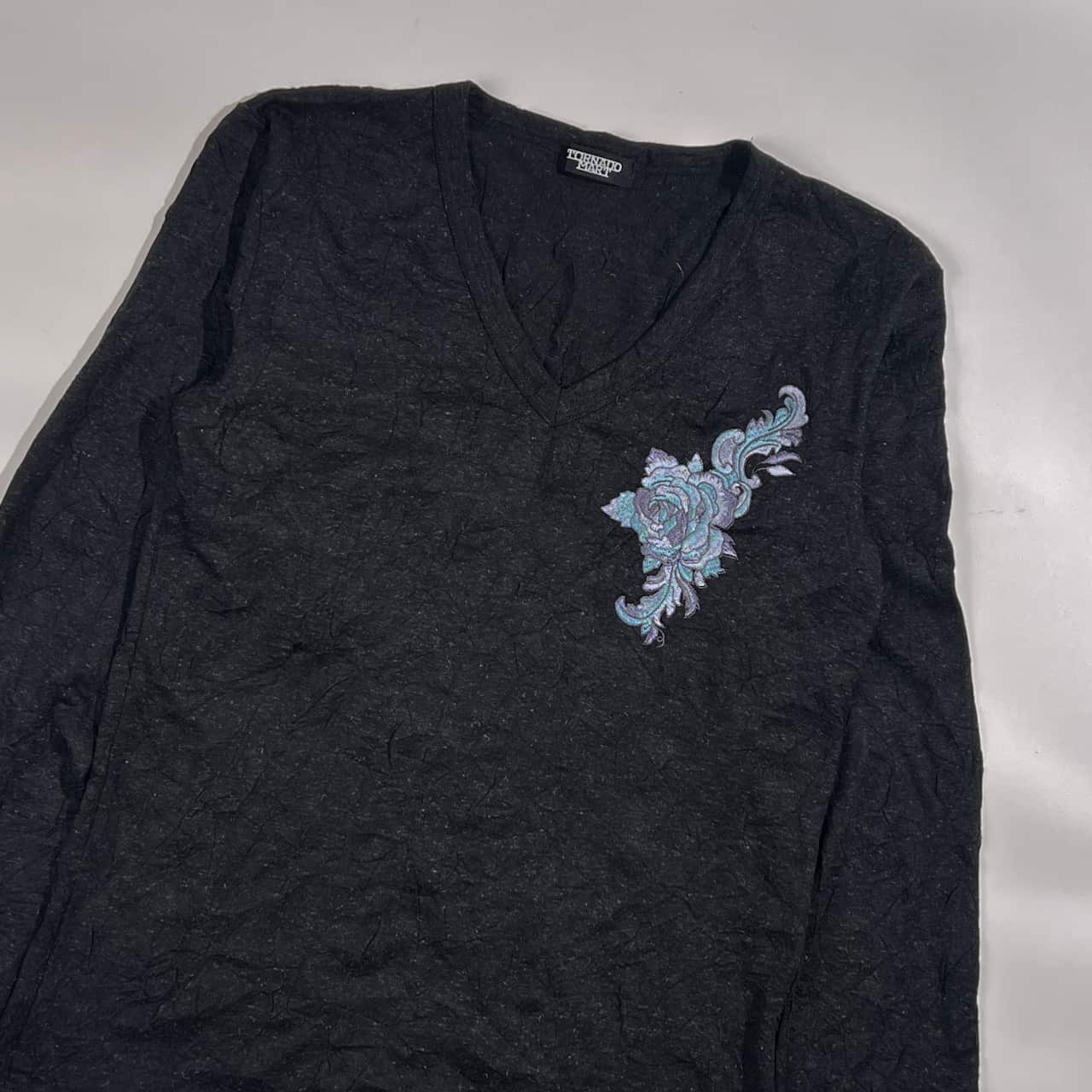 TORNADO MART トルネードマート シワ加工 刺繍 Vネック 長袖 カットソー /ダークグレー レディース
