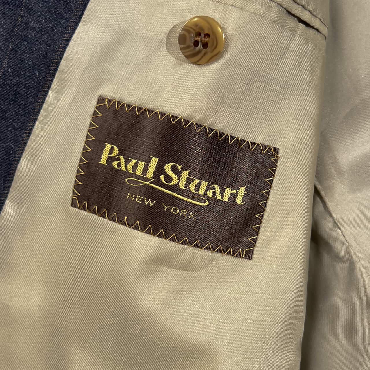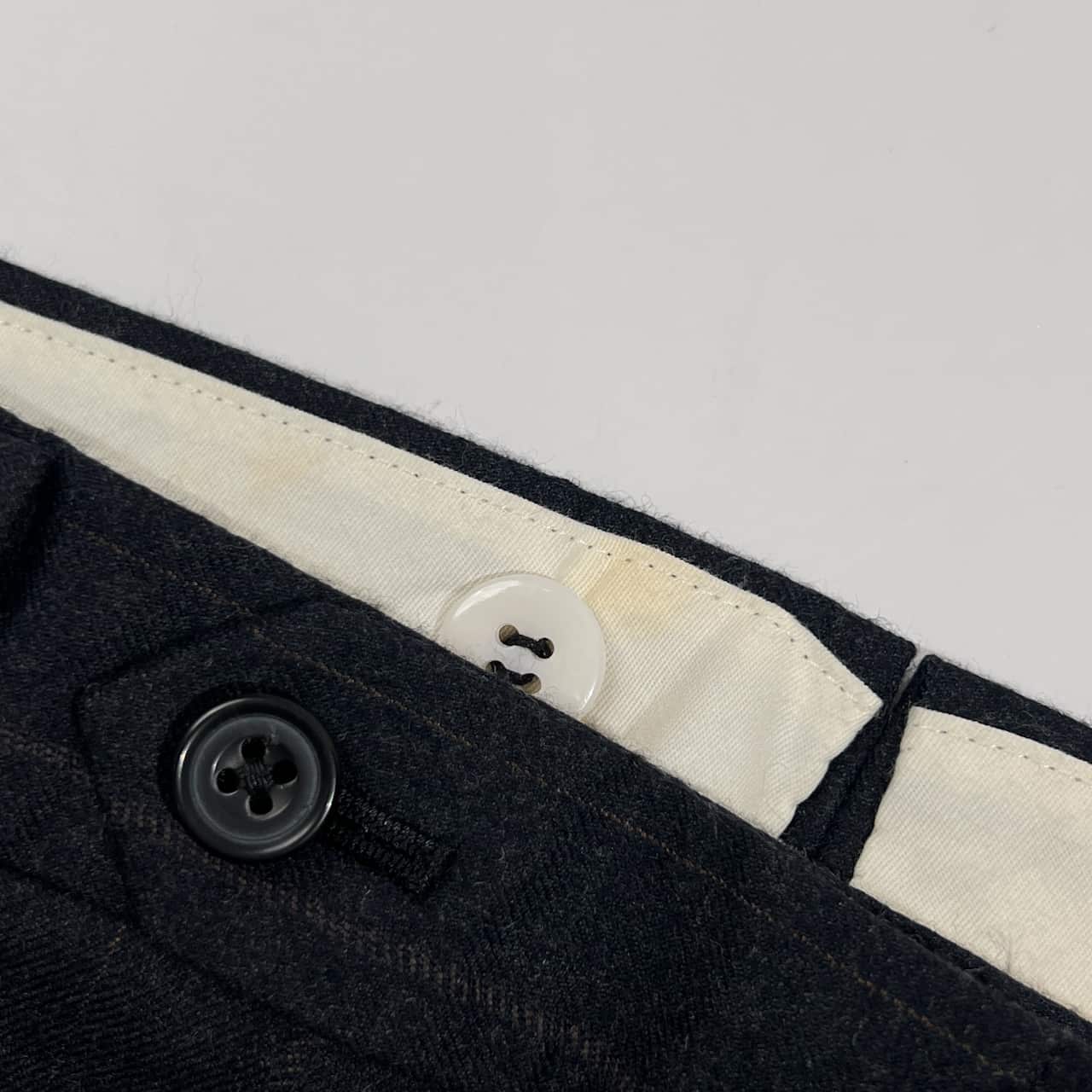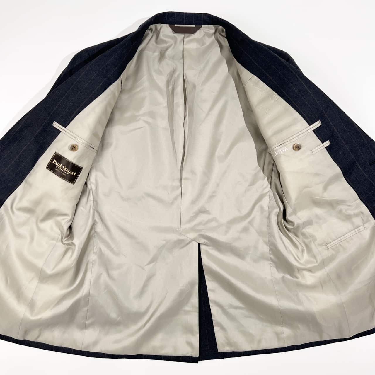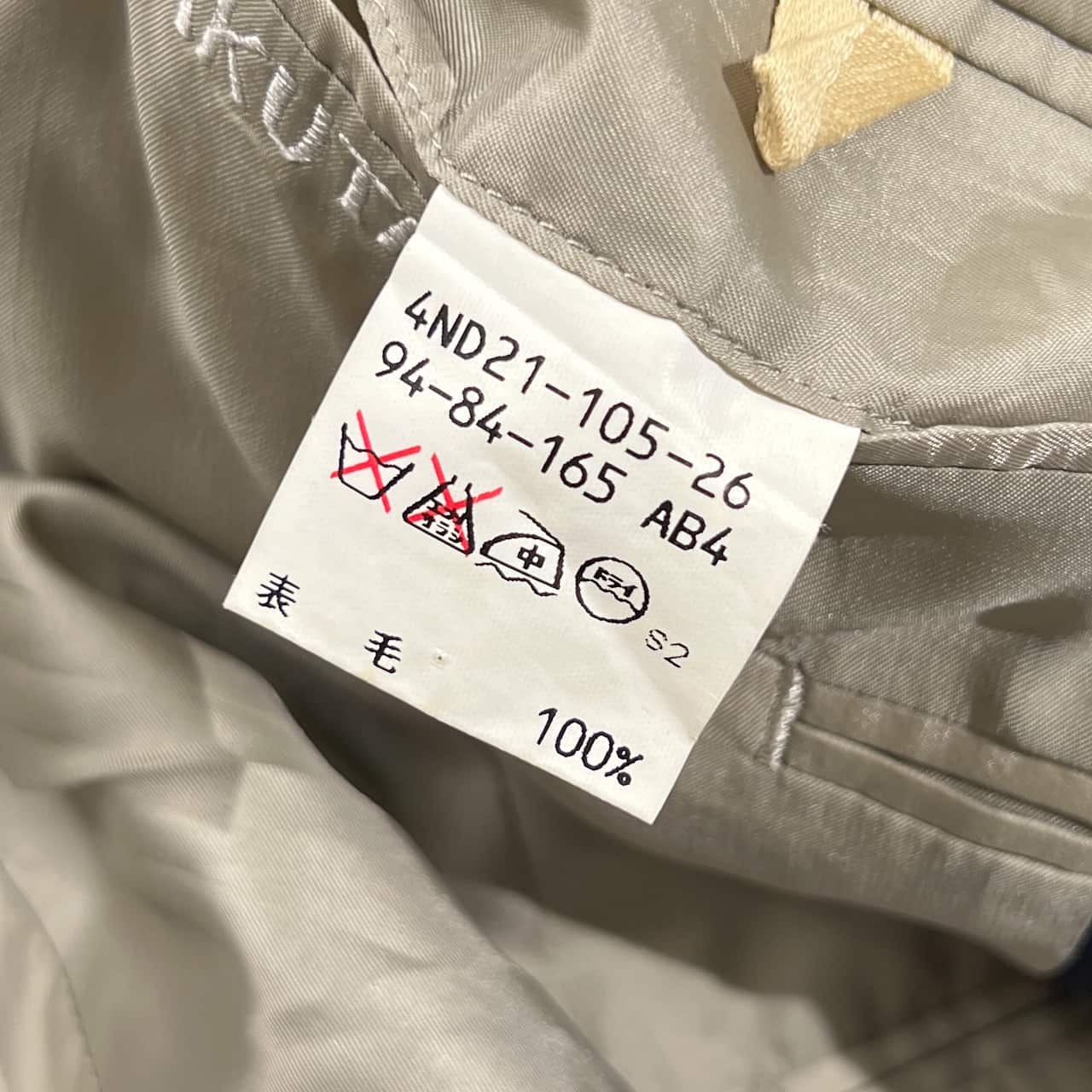 裏地にネーム刺繍入りのお品物です。ジャケットの袖、パンツのウエスト裏側によごれがあります。コンデションについての詳細は画像をご参照ください。