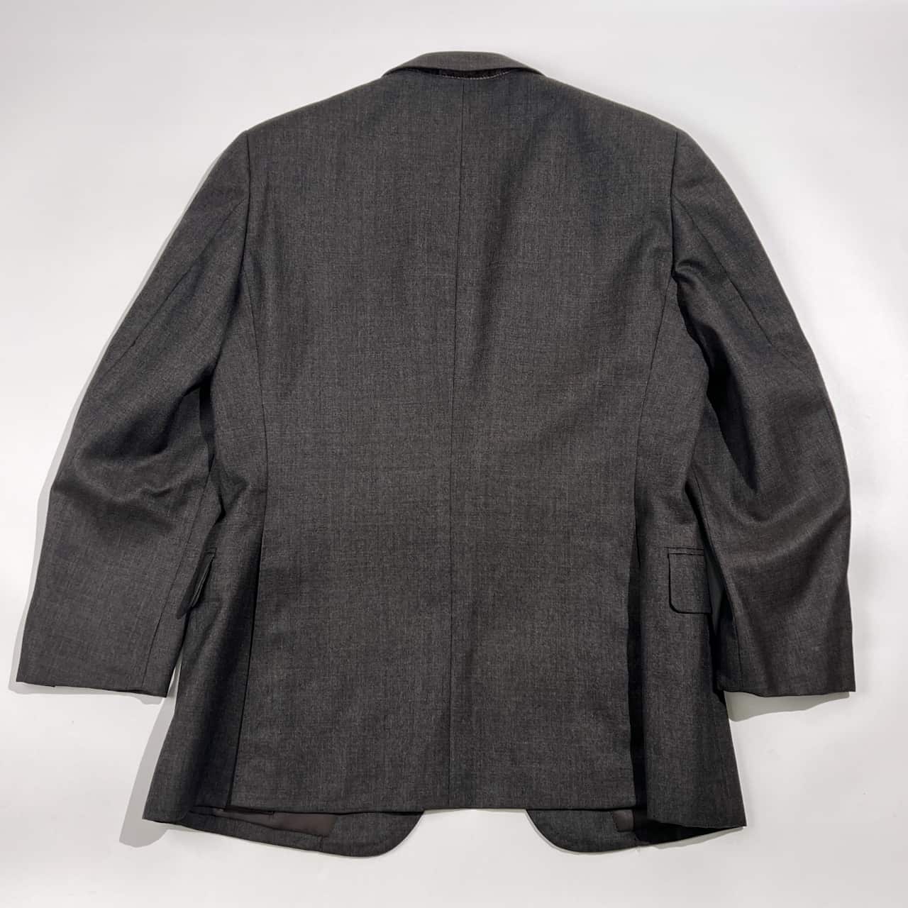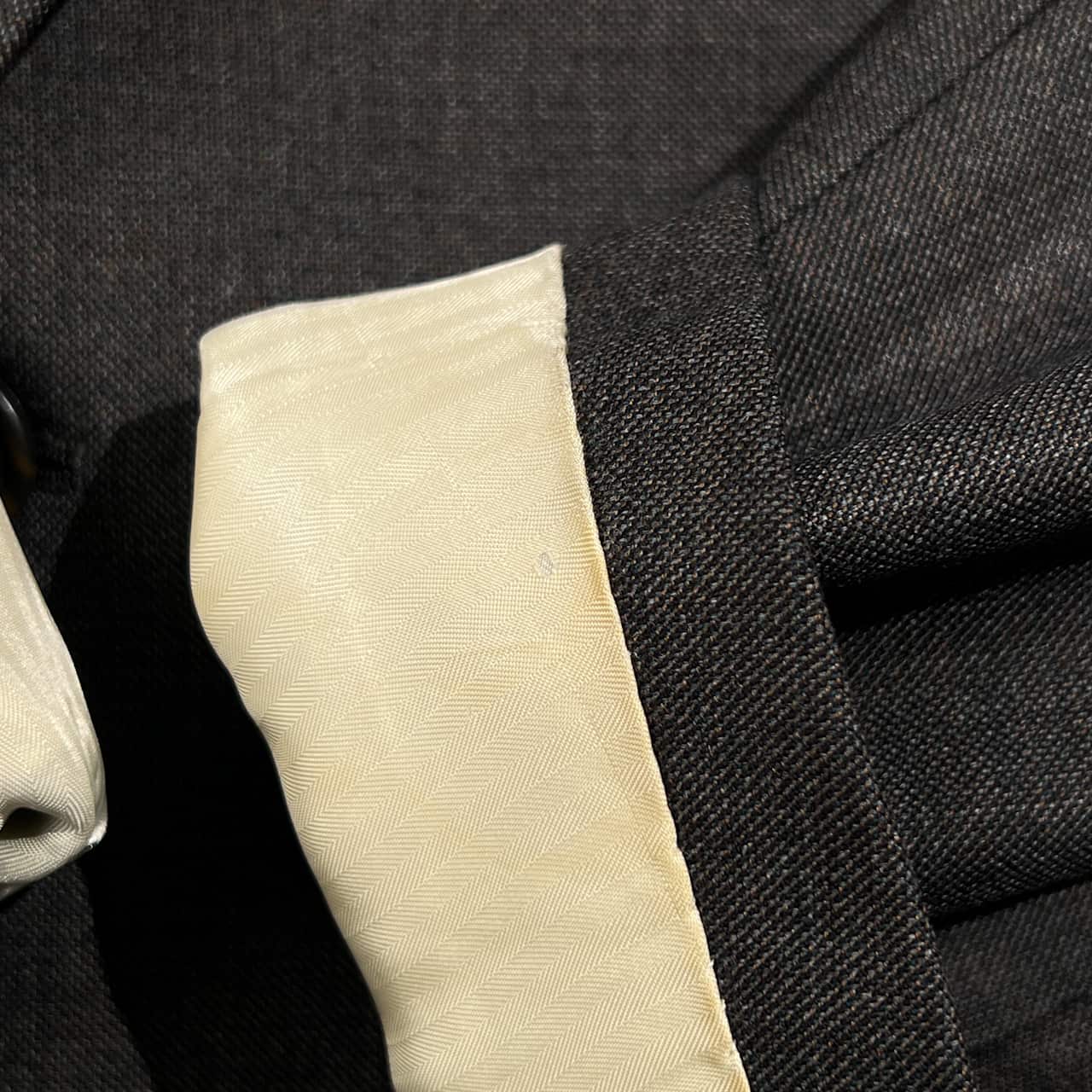 裏地にネーム刺繍入りのお品物です。ジャケットの袖裏にうすよごれ、小穴、脇裏によごれがあり、パンツにいくつかの小穴、お尻部分に系のほどけ、裏地によごれがあります。コンデションについての詳細は画像をご参照ください。
