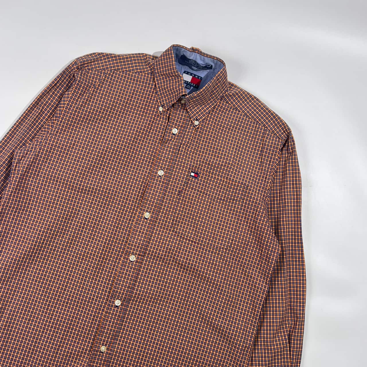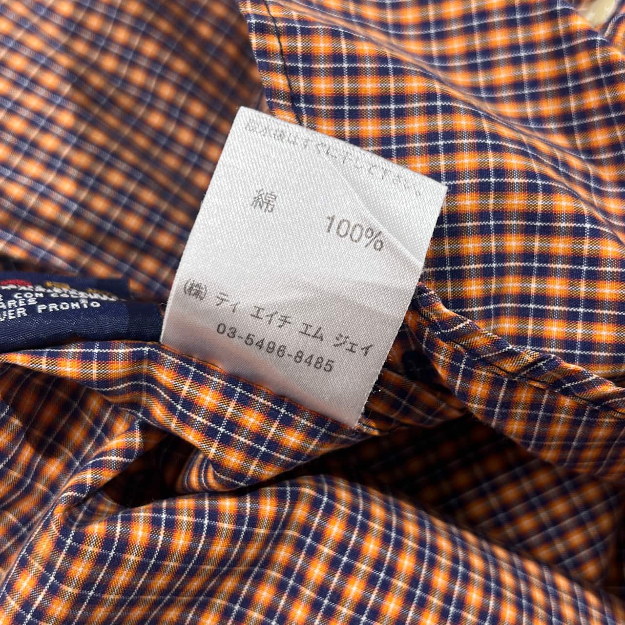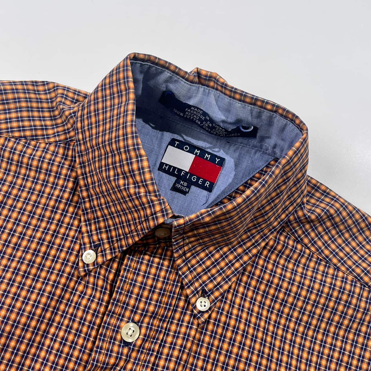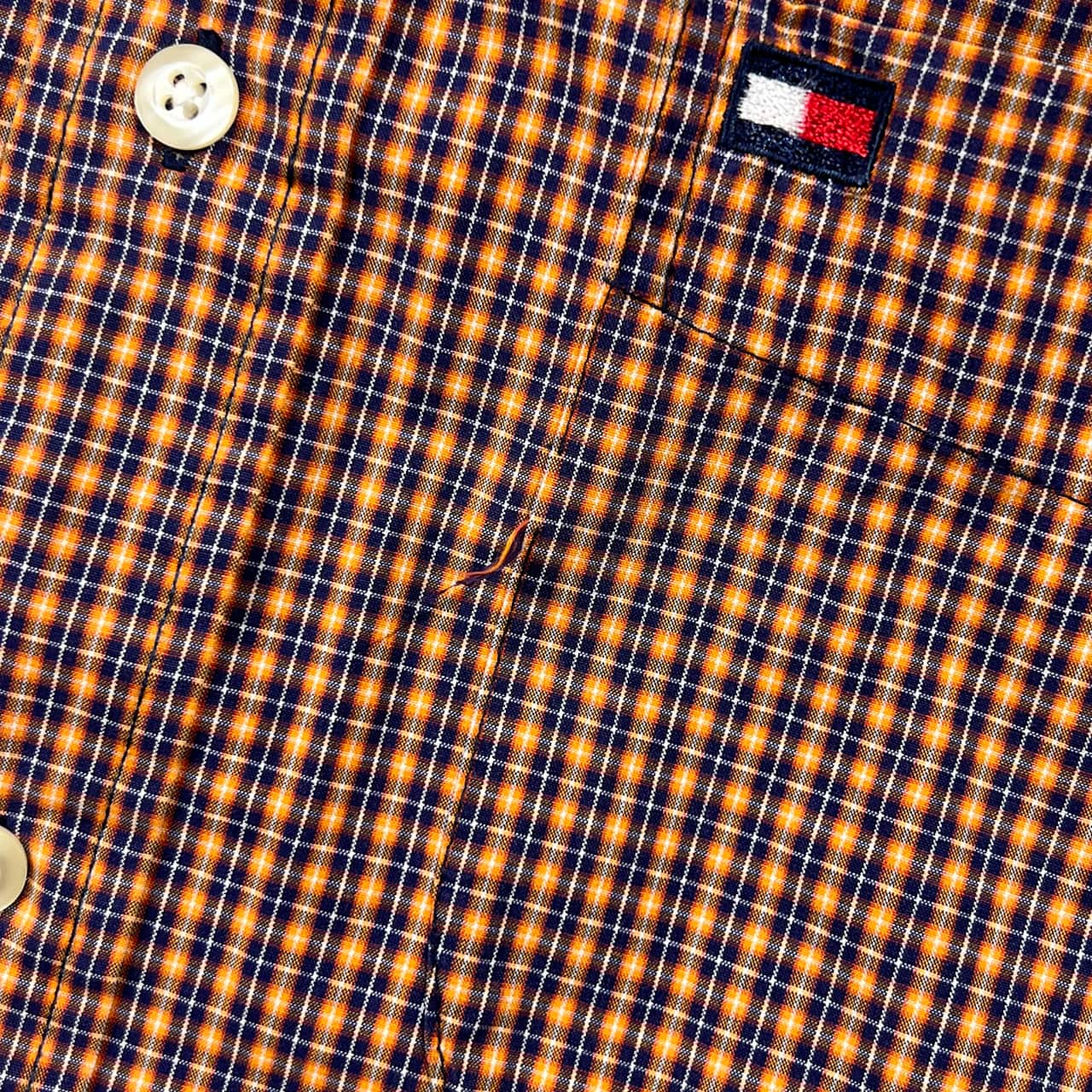 90s TOMMY HILFIGER トミーヒルフィガー フラッグ刺繍 チェック柄 長袖 ボタンダウンシャツ XS /オレンジ×ネイビー系 メンズ ビンテージ