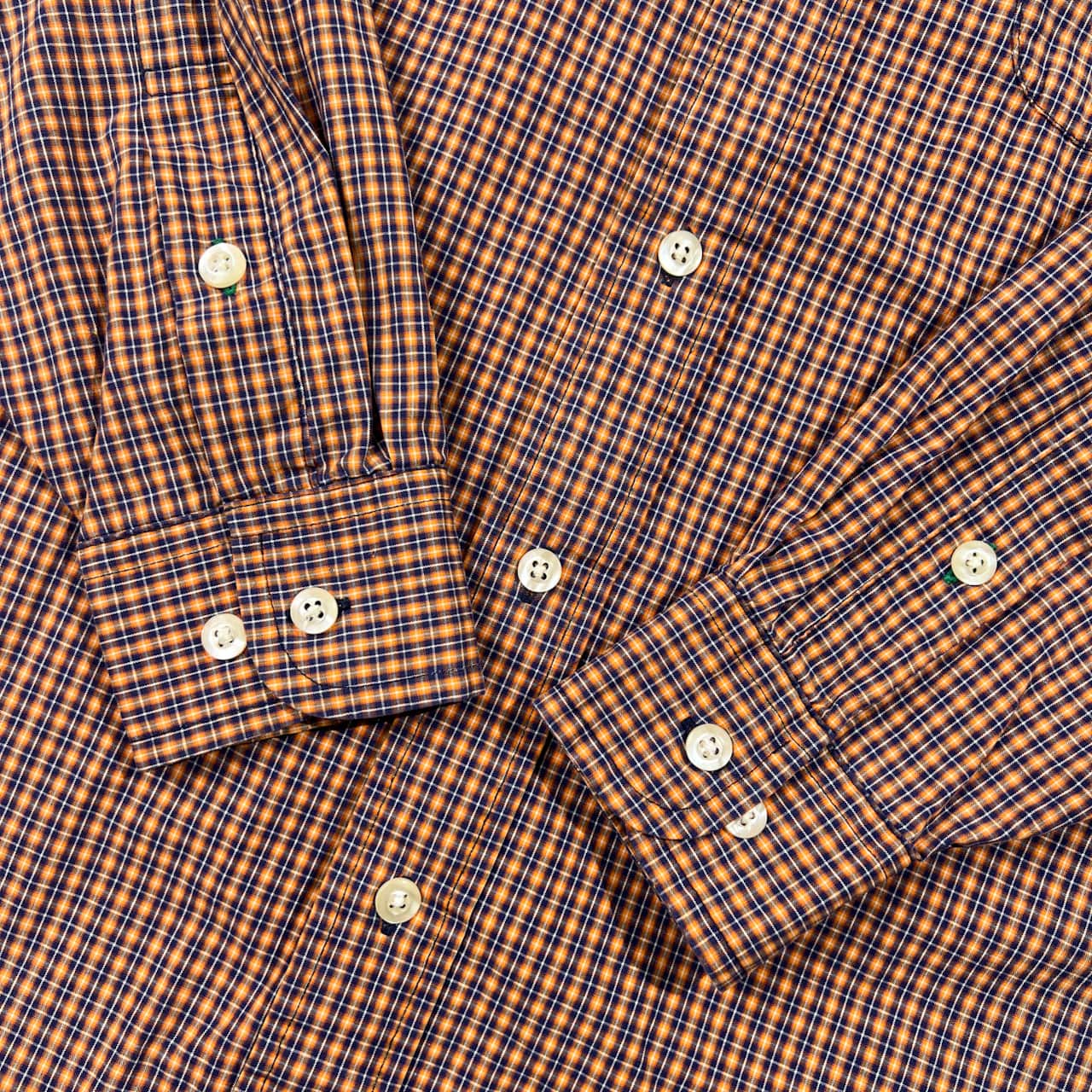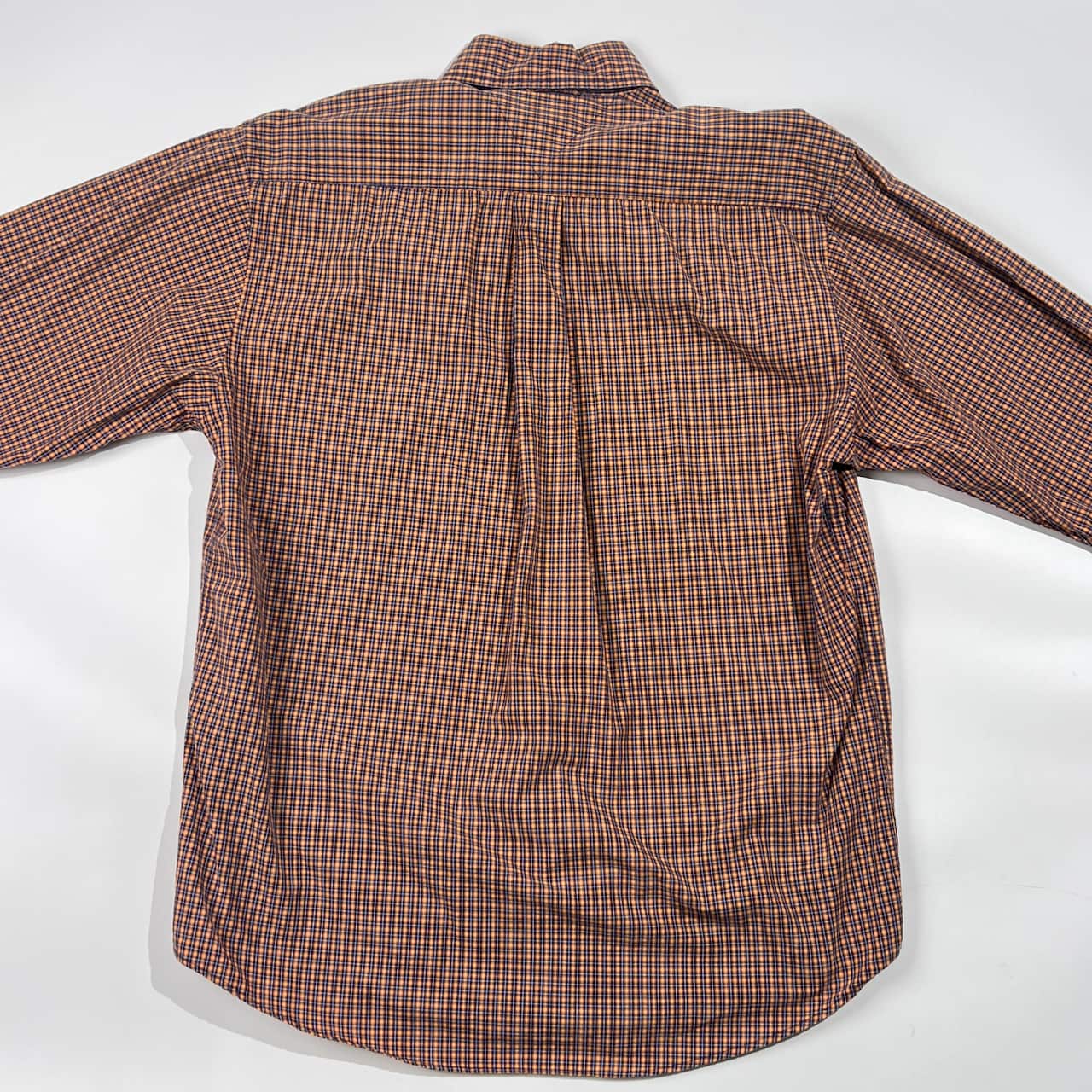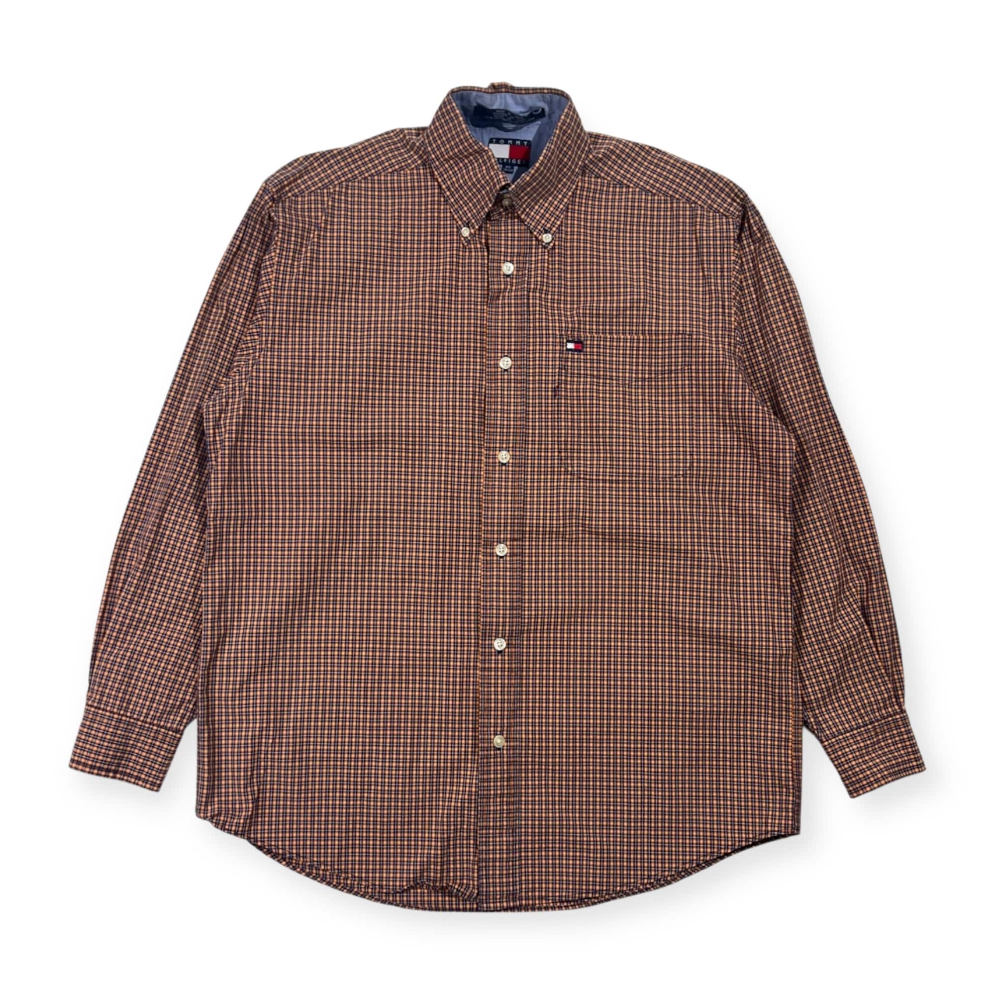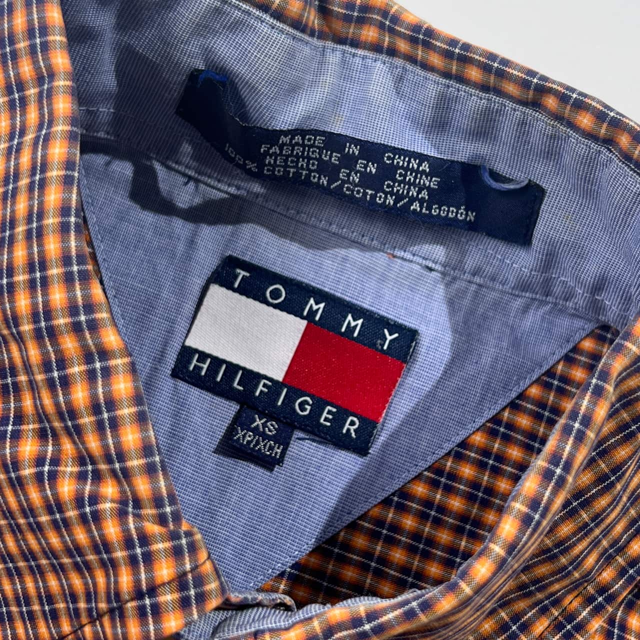 90s TOMMY HILFIGER トミーヒルフィガー フラッグ刺繍 チェック柄 長袖 ボタンダウンシャツ XS /オレンジ×ネイビー系 メンズ ビンテージ