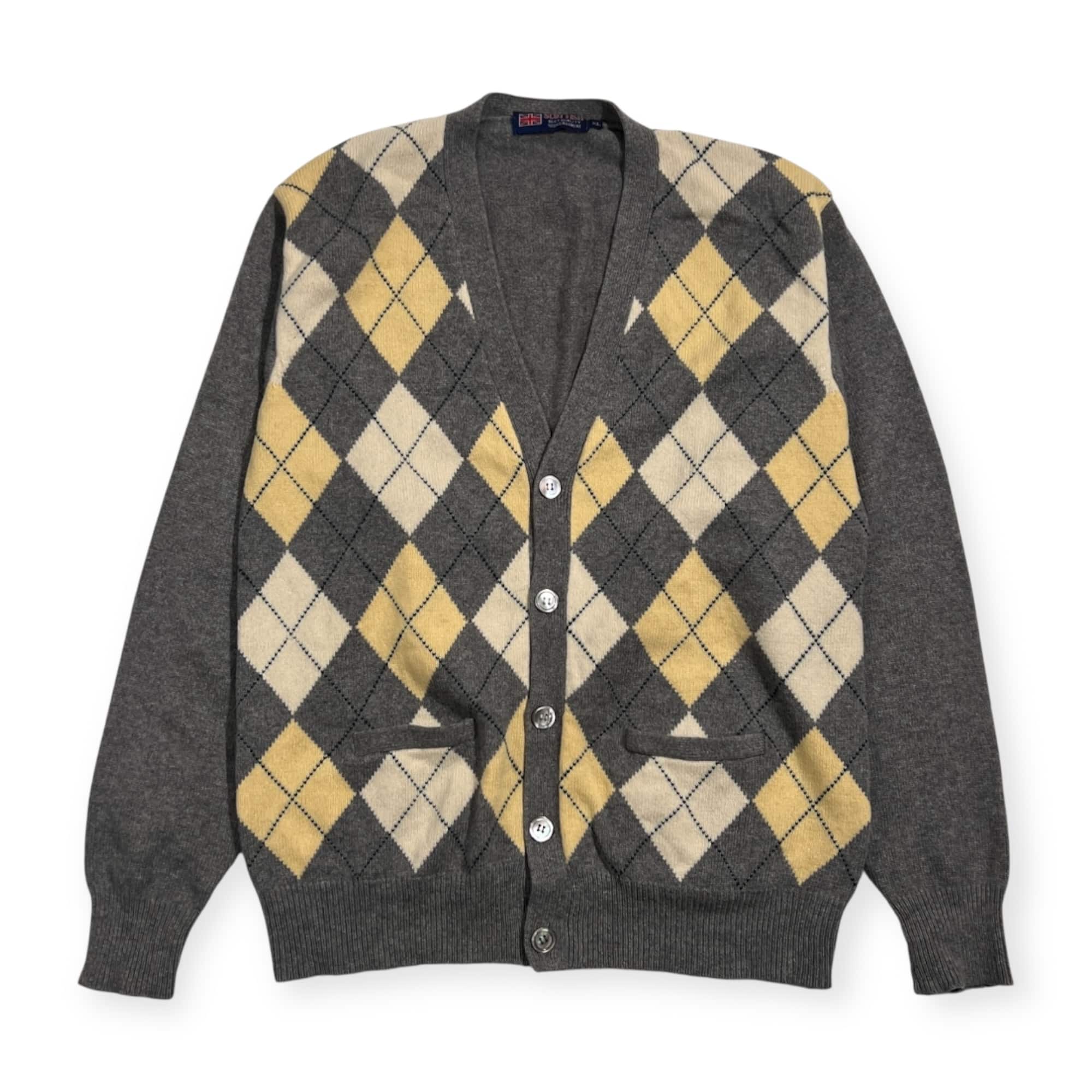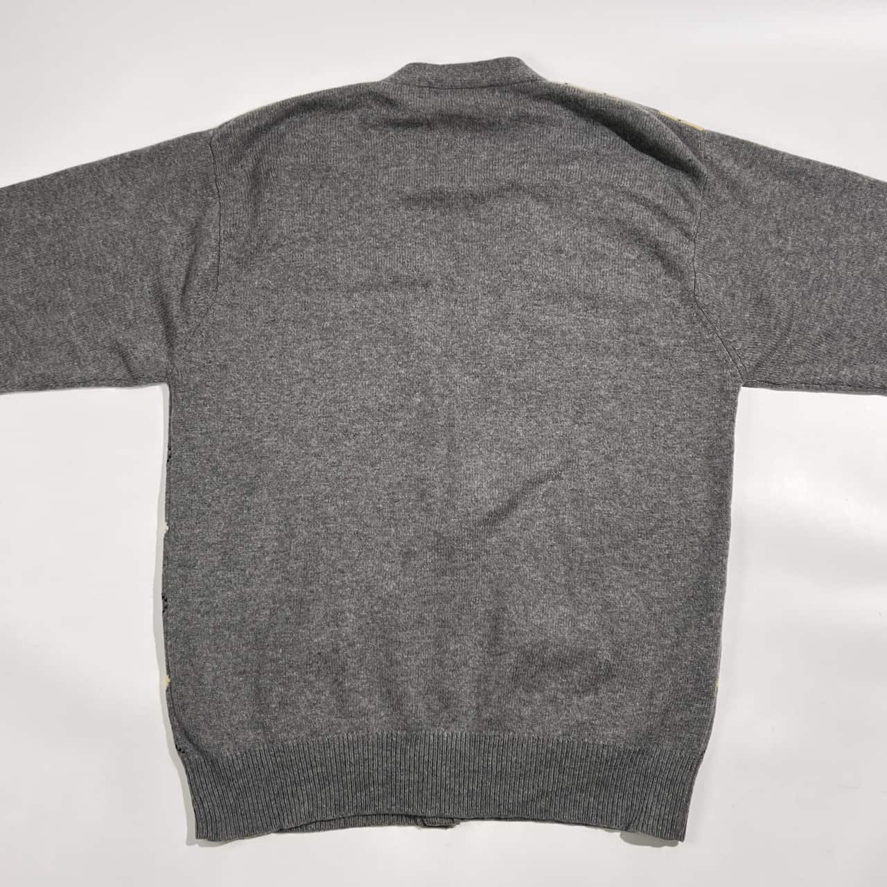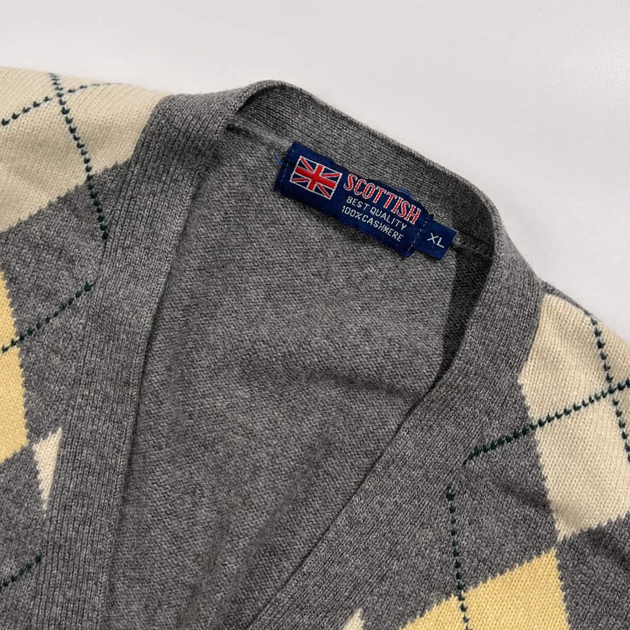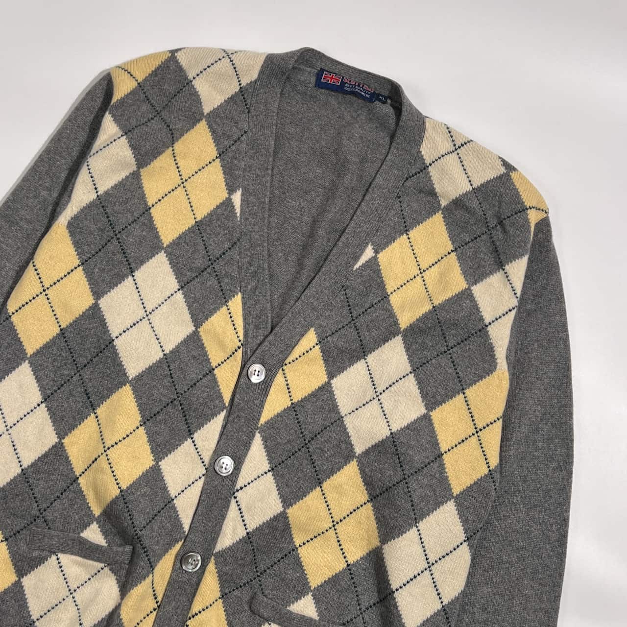 カシミヤ100% SCOTTISH スコッティシュ アーガイル柄 Vネック ニット カーディガン XL/グレー系 メンズ