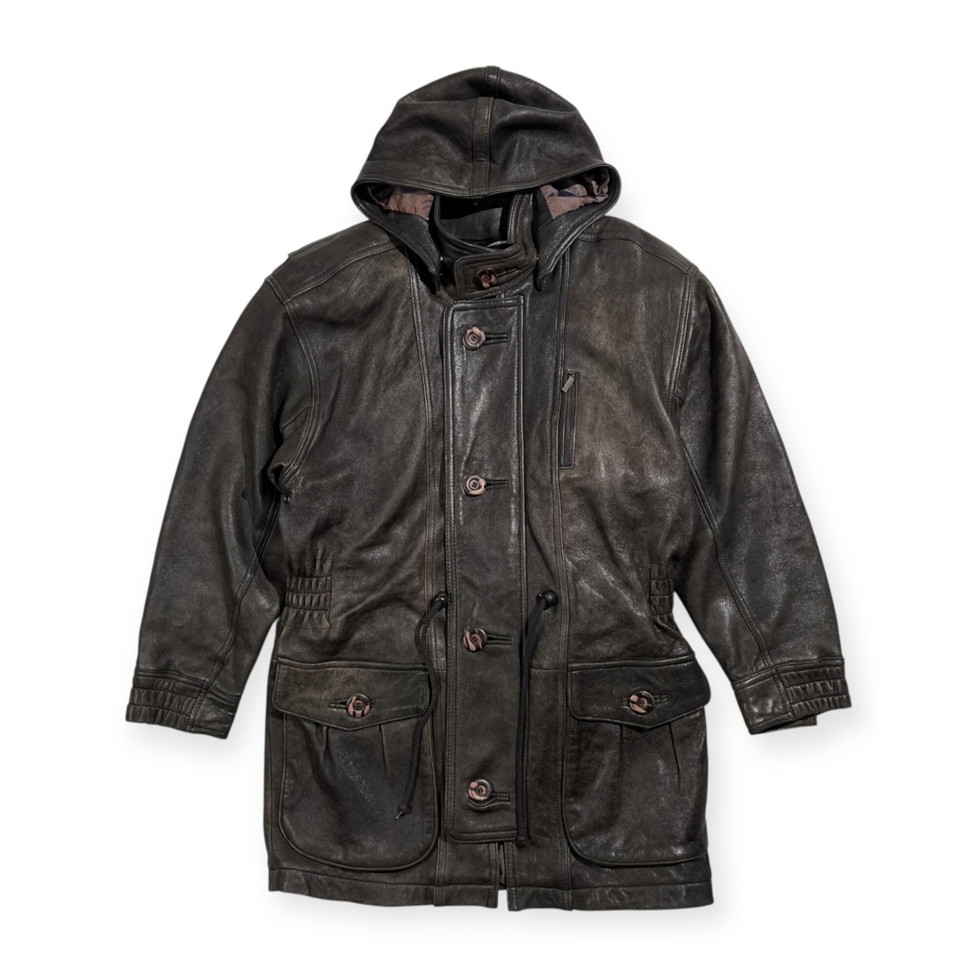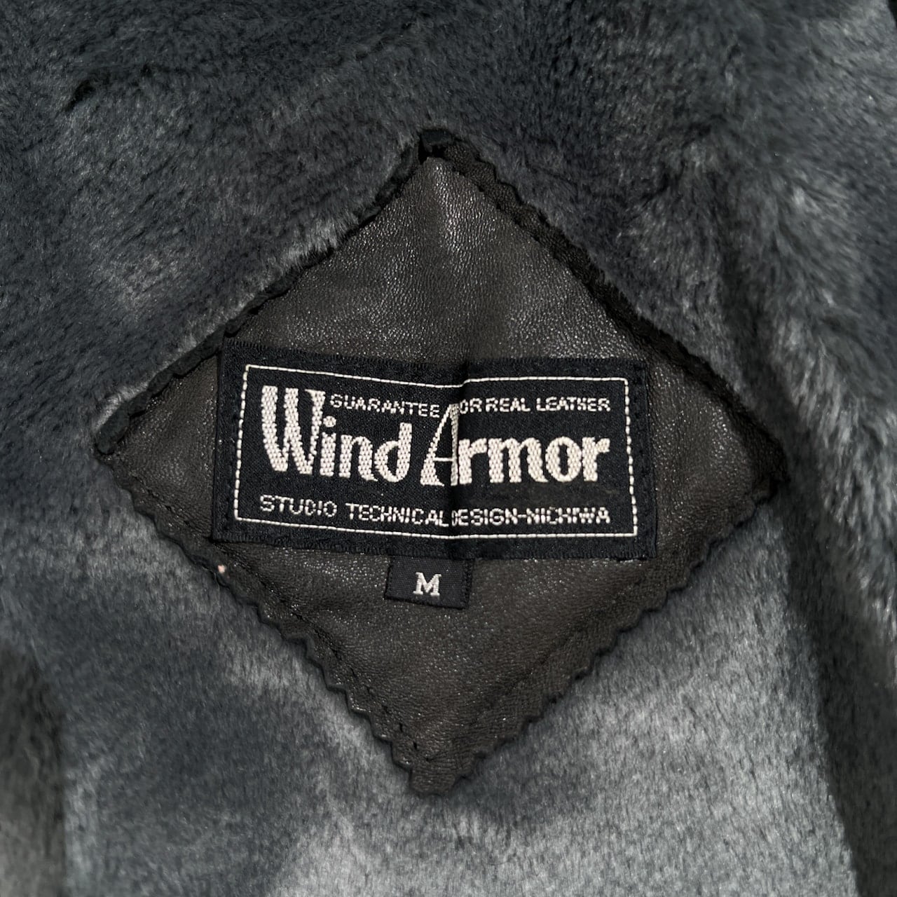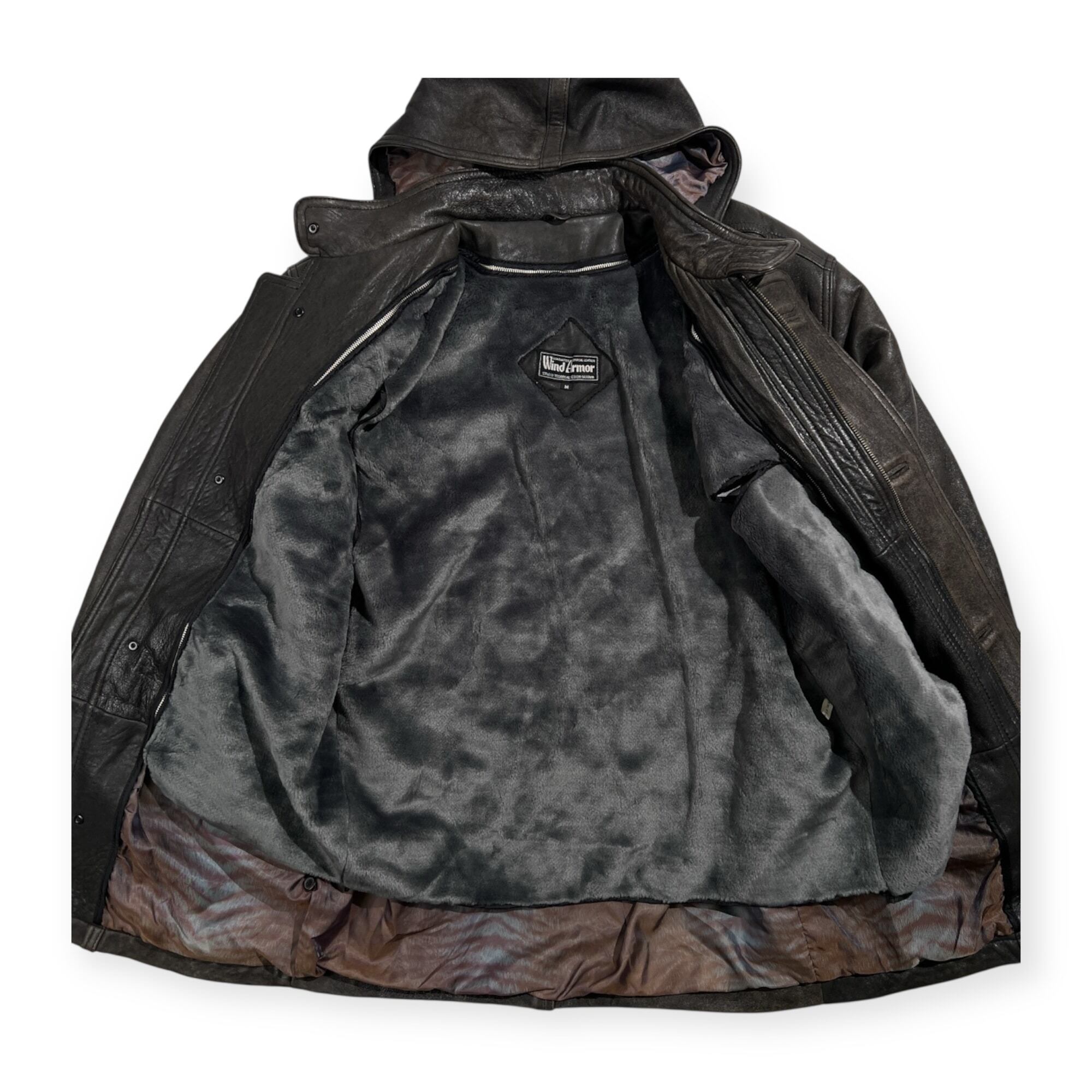 Wind Armor ウィンドアーマー 羊革 ラムレザー 本革 フーデッド ハーフ コート サイズ M /ブラック系 裏地アニマル柄