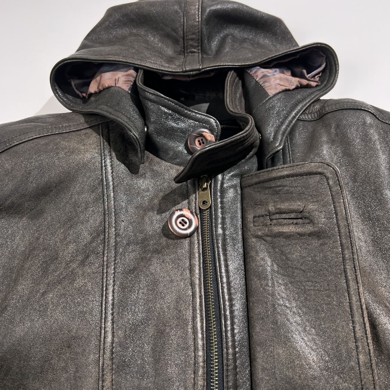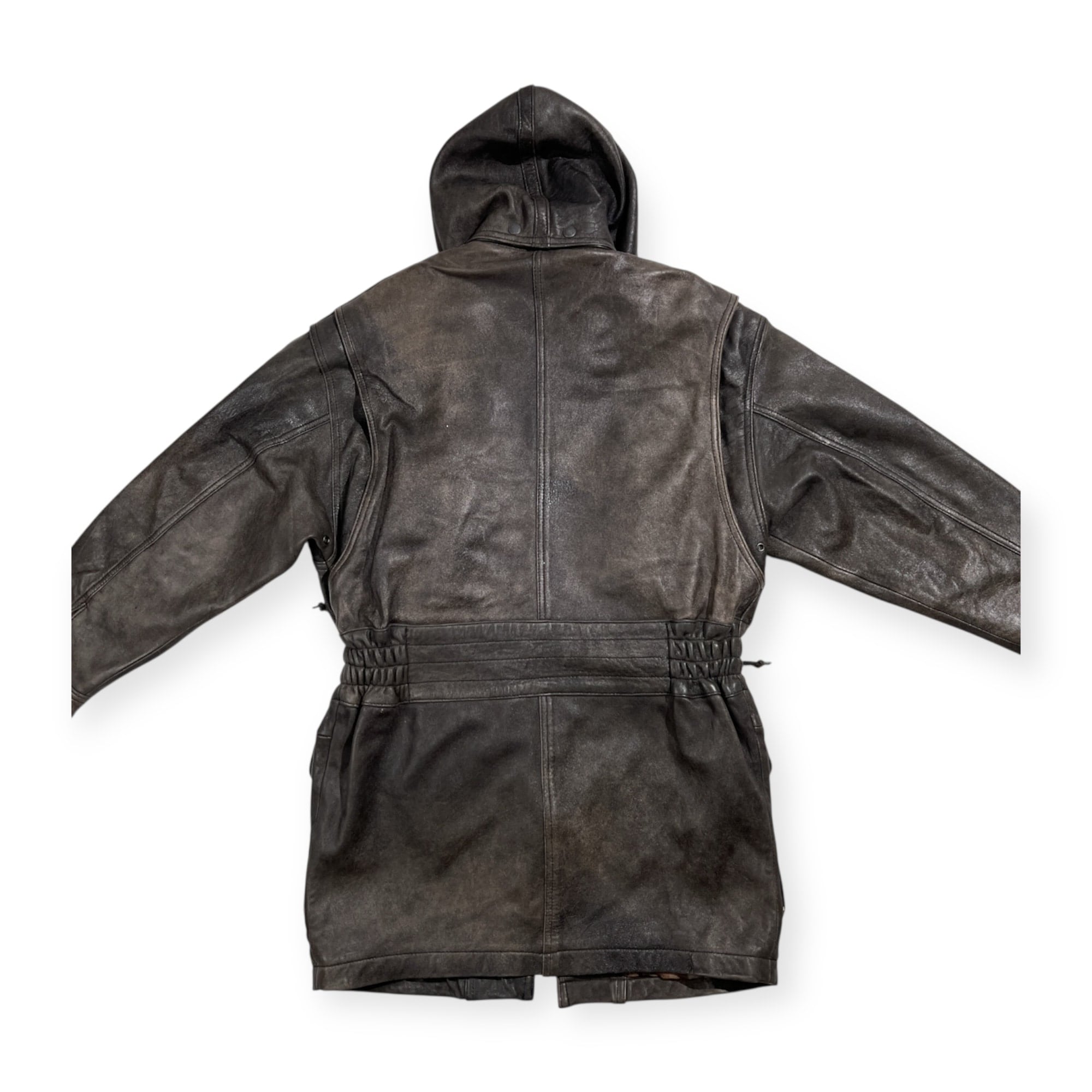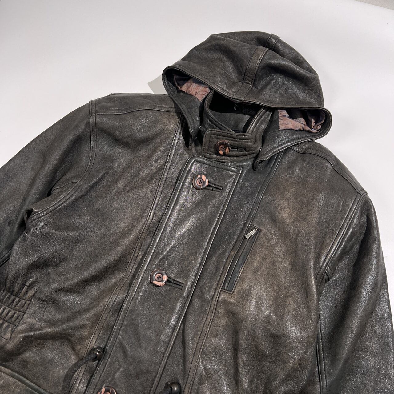 Wind Armor ウィンドアーマー 羊革 ラムレザー 本革 フーデッド ハーフ コート サイズ M /ブラック系 裏地アニマル柄