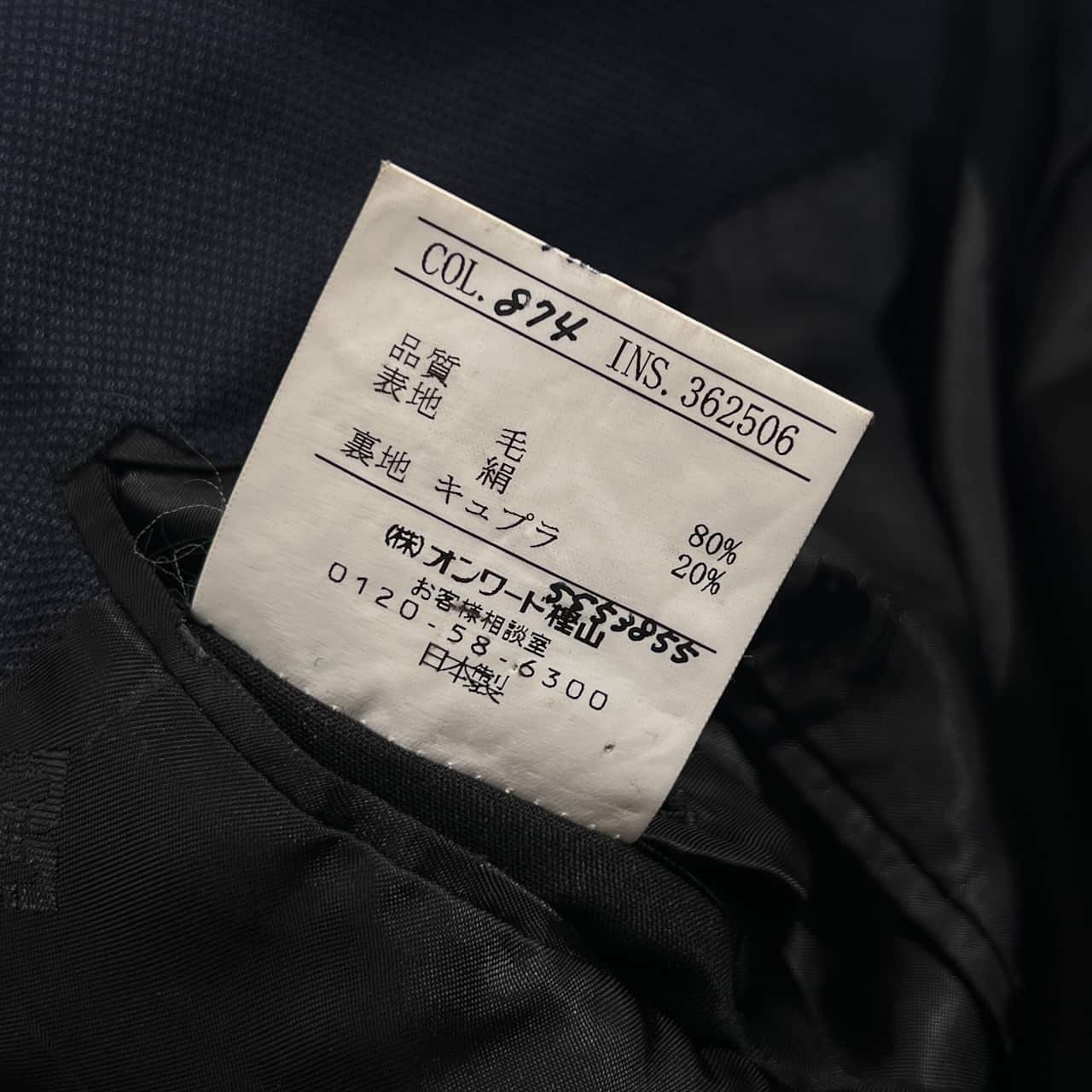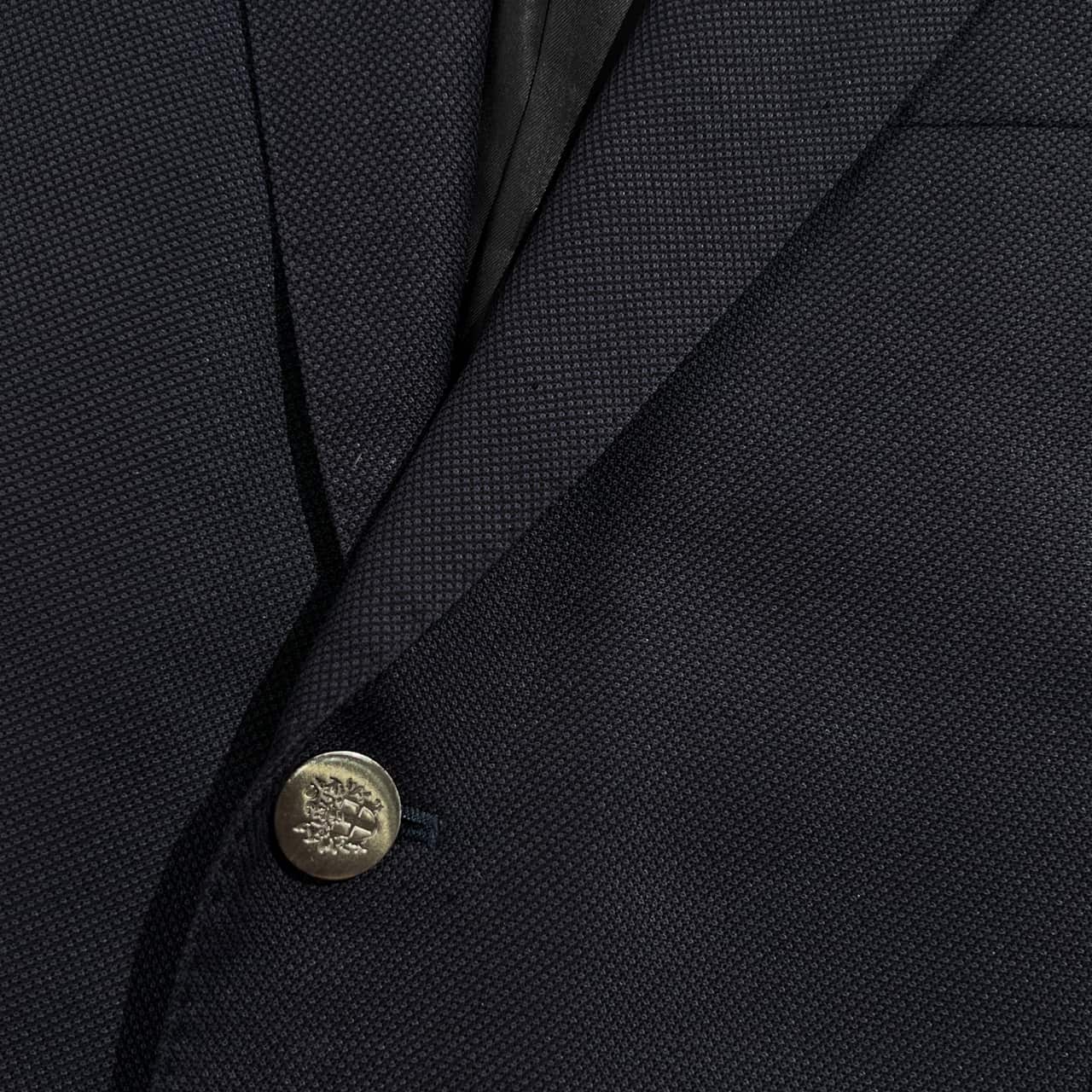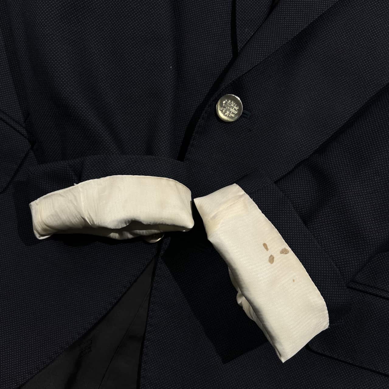 裏地にネーム刺繍入りのお品物です。身頃にいくつかのほつれ、袖先によごれ、袖先のボタンが一つ欠損しております。コンデションについての詳細は画像をご参照ください。