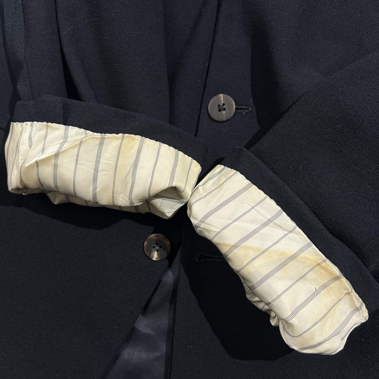 袖先裏、フロント内側によごれがあり、品タグがとれかけており、一番上のボタンが欠損しております。コンデションについての詳細は画像をご参照ください。