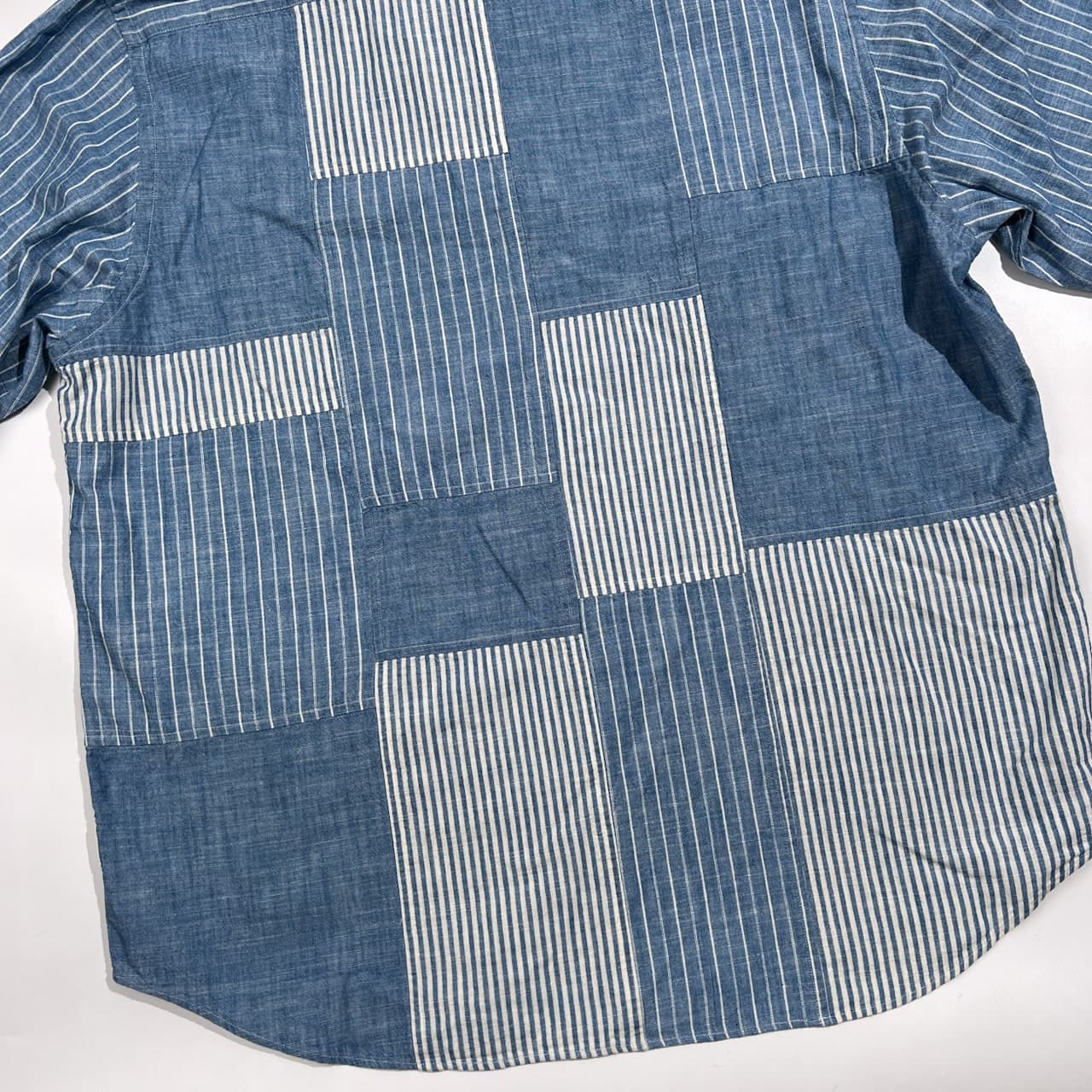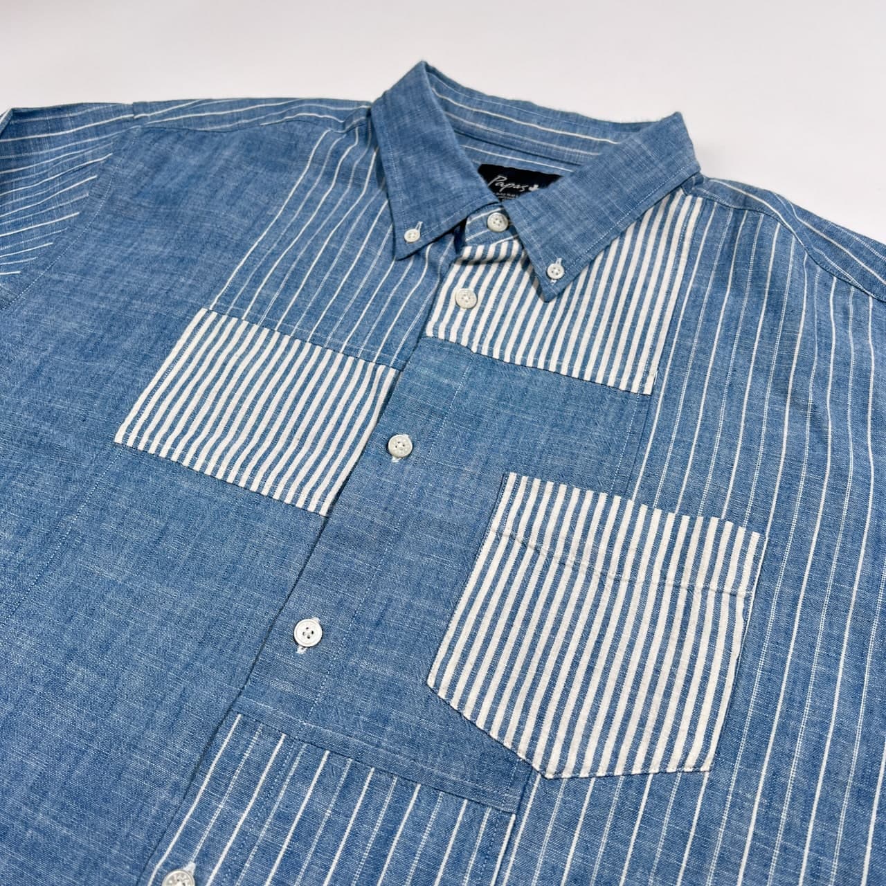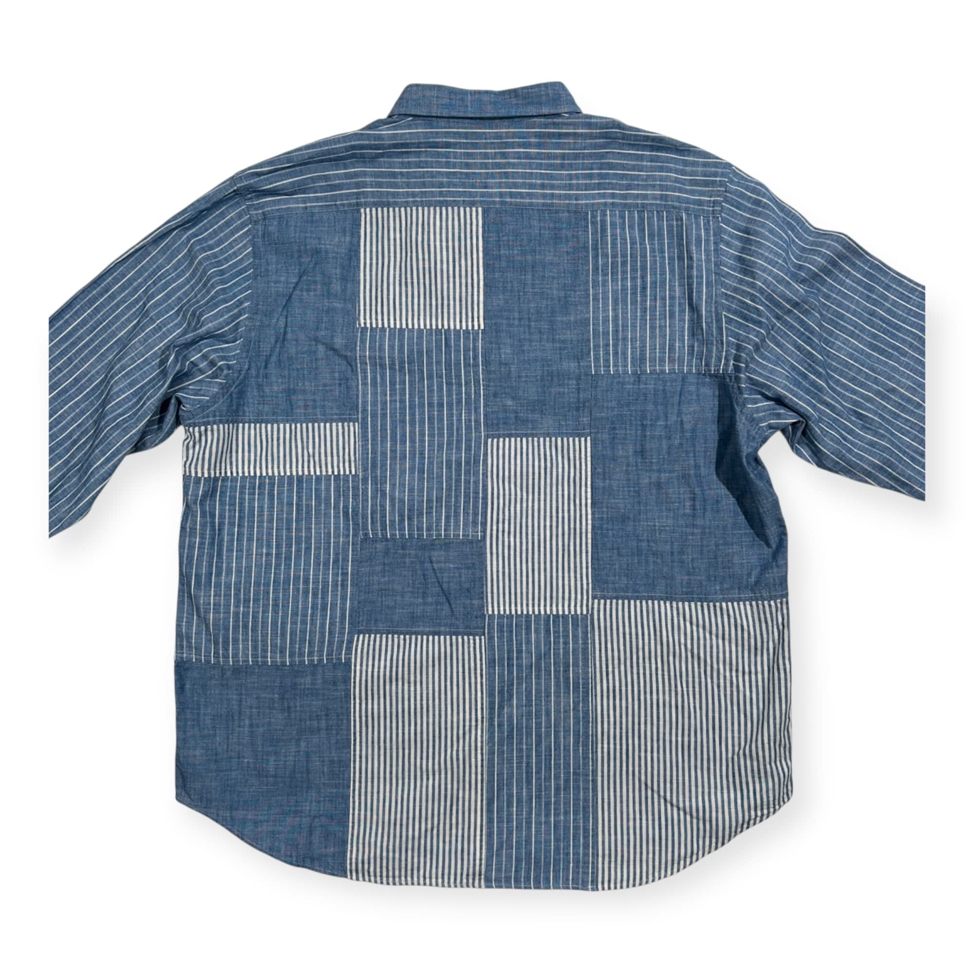 美品 PAPAS PLUS パパス プラス パッチワーク ストライプ シャンブレー BD 長袖シャツ サイズ LL /ブルー系/メンズ/日本製