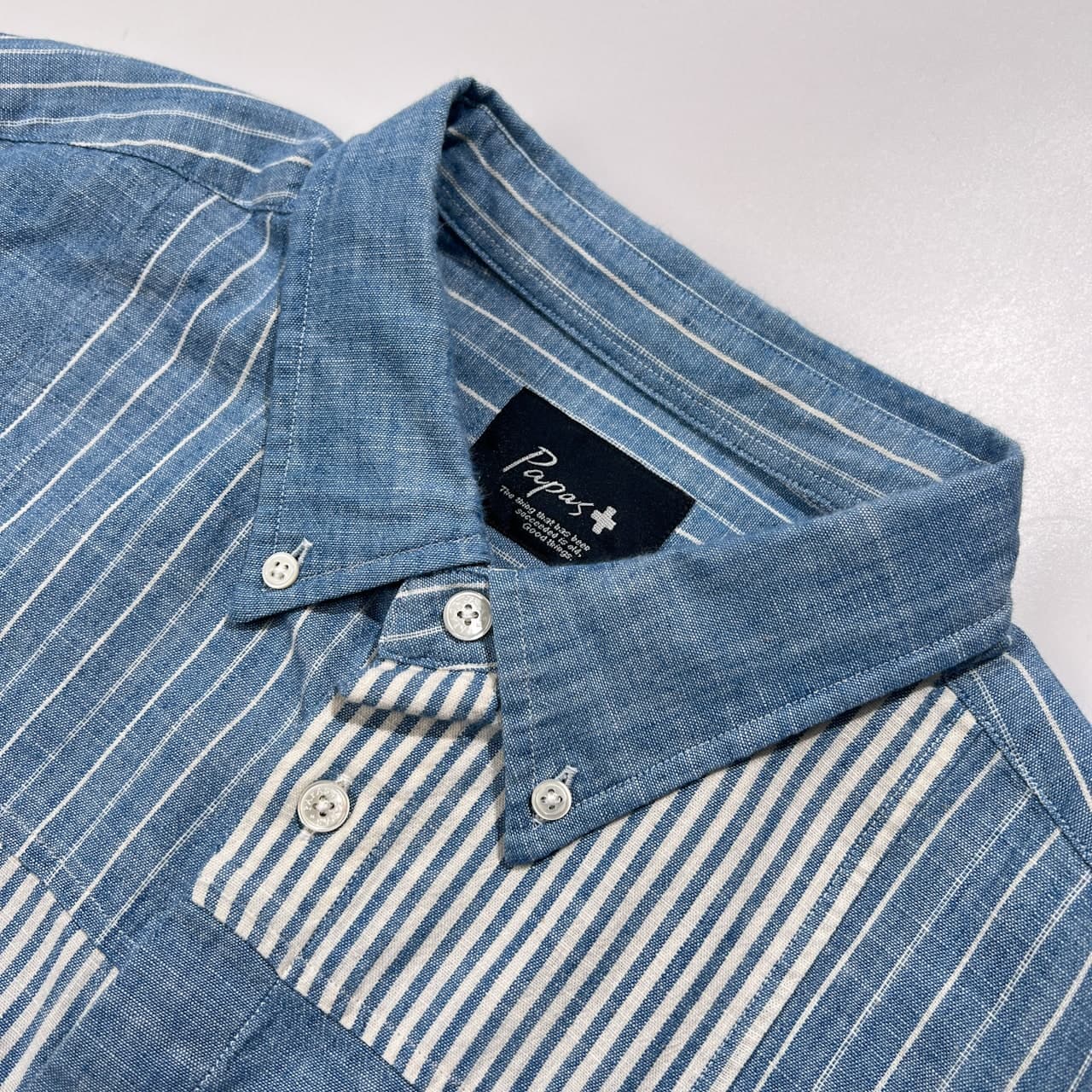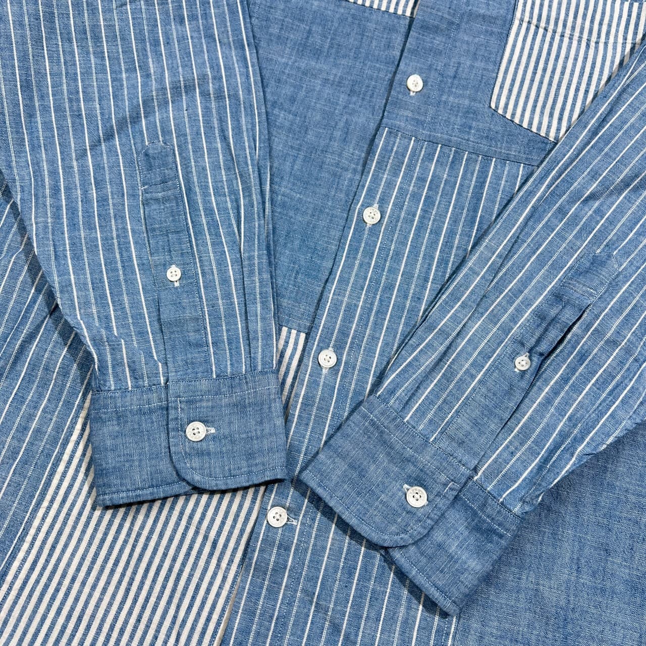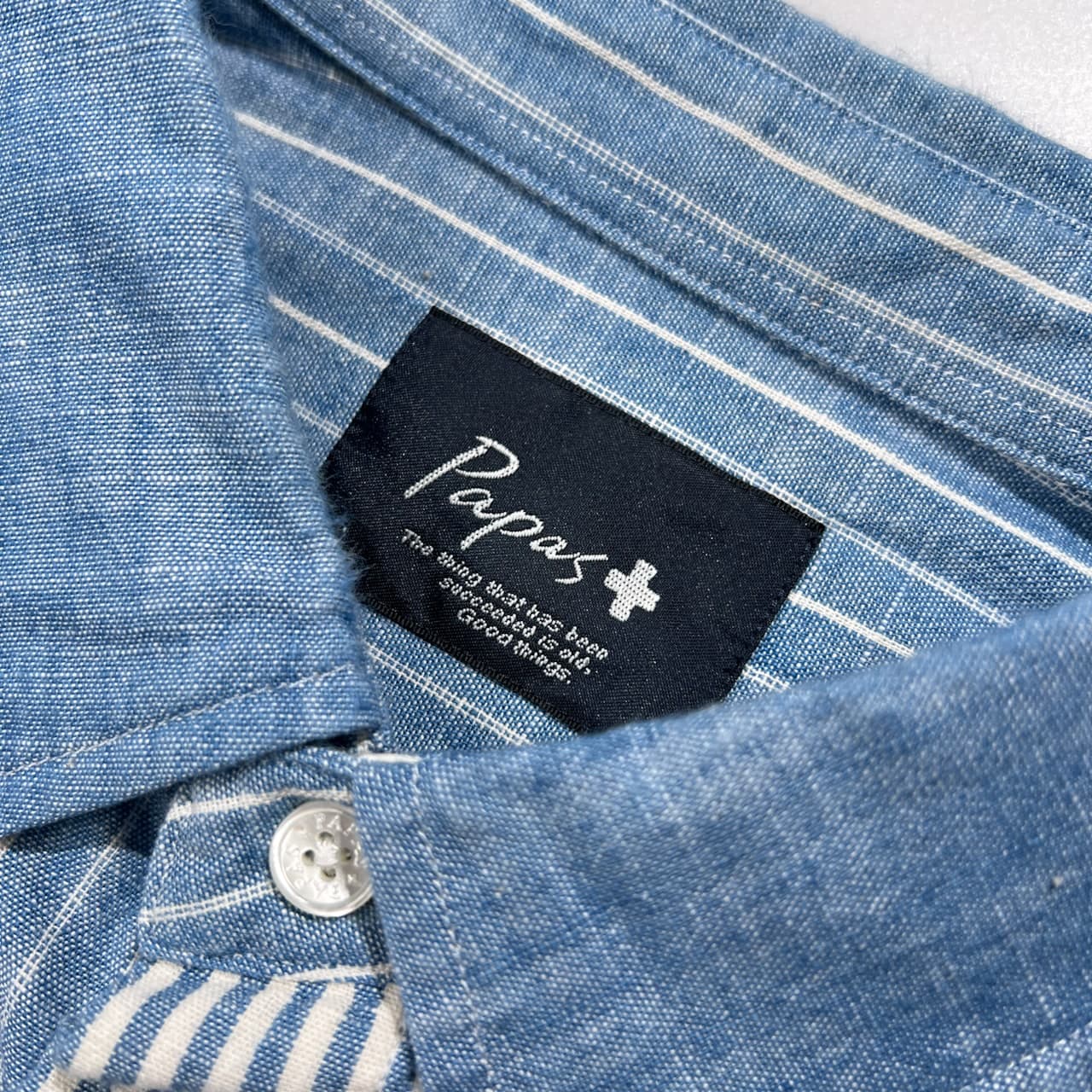 美品 PAPAS PLUS パパス プラス パッチワーク ストライプ シャンブレー BD 長袖シャツ サイズ LL /ブルー系/メンズ/日本製