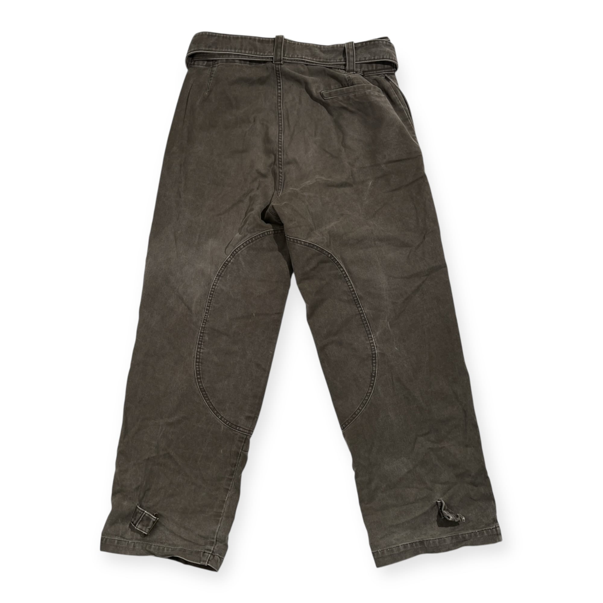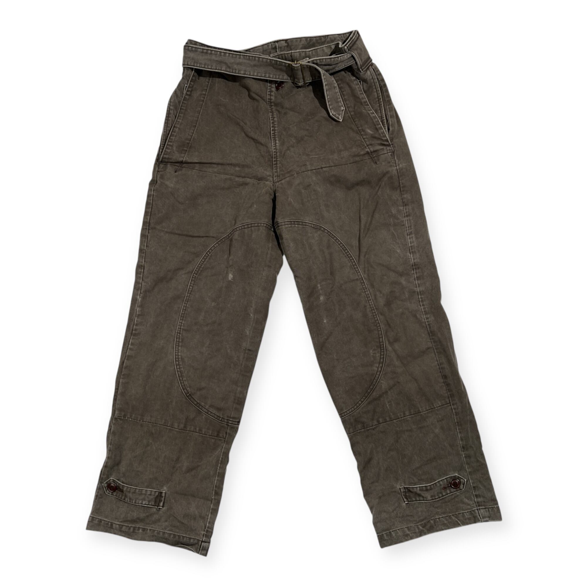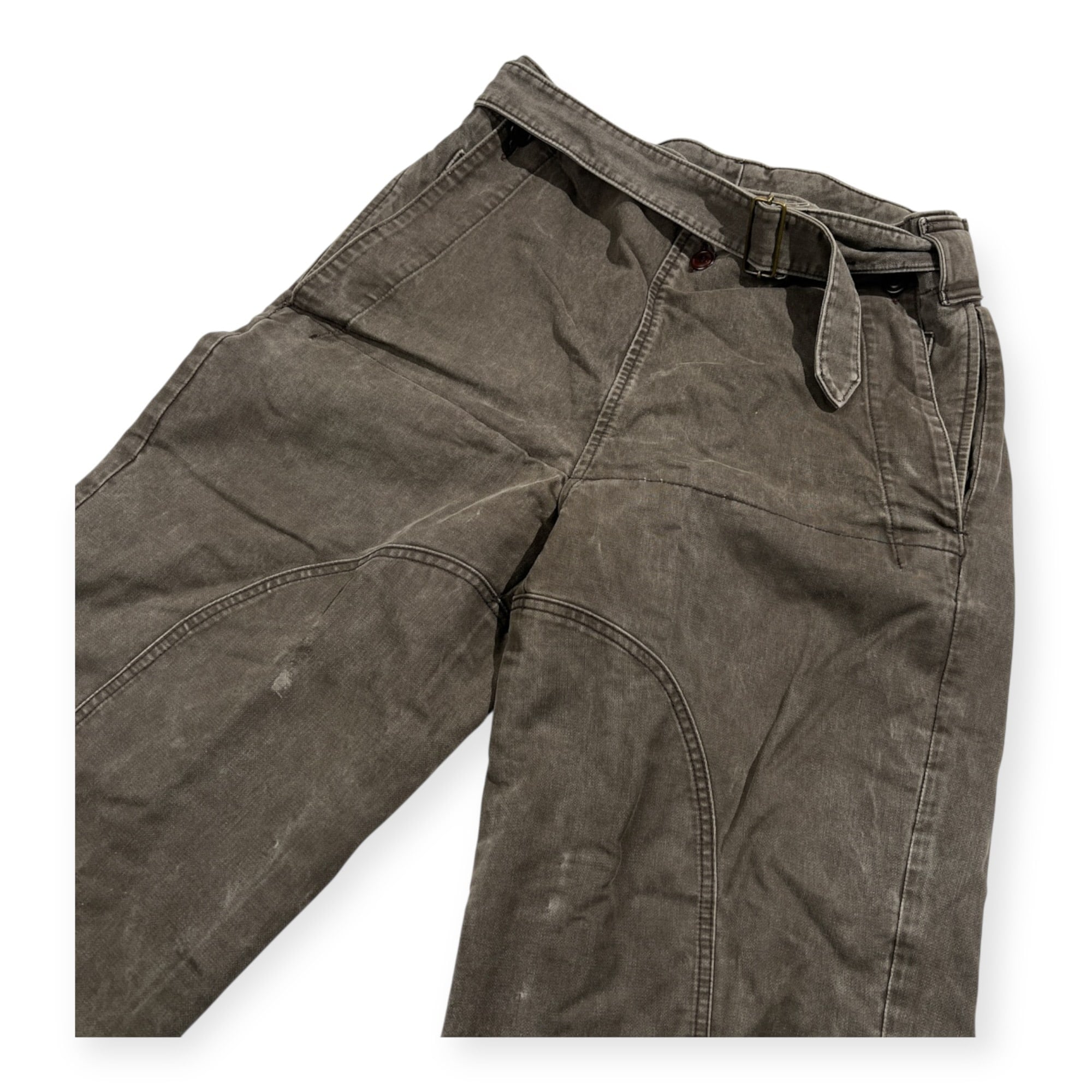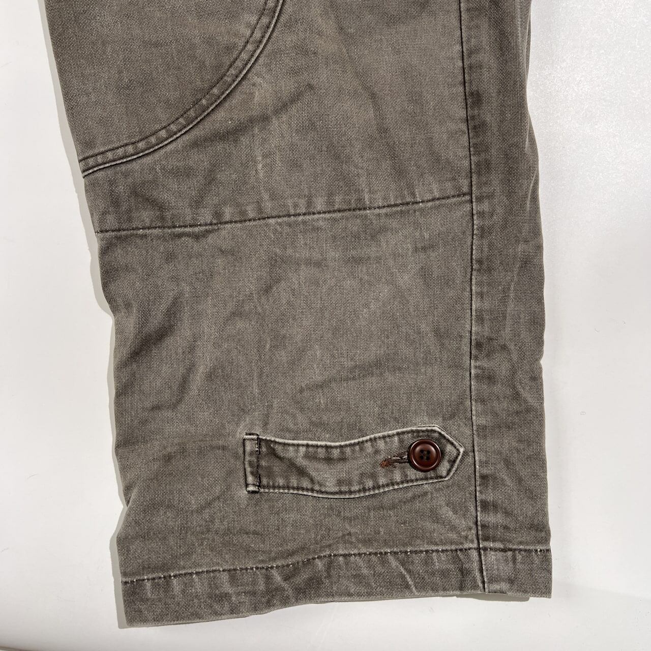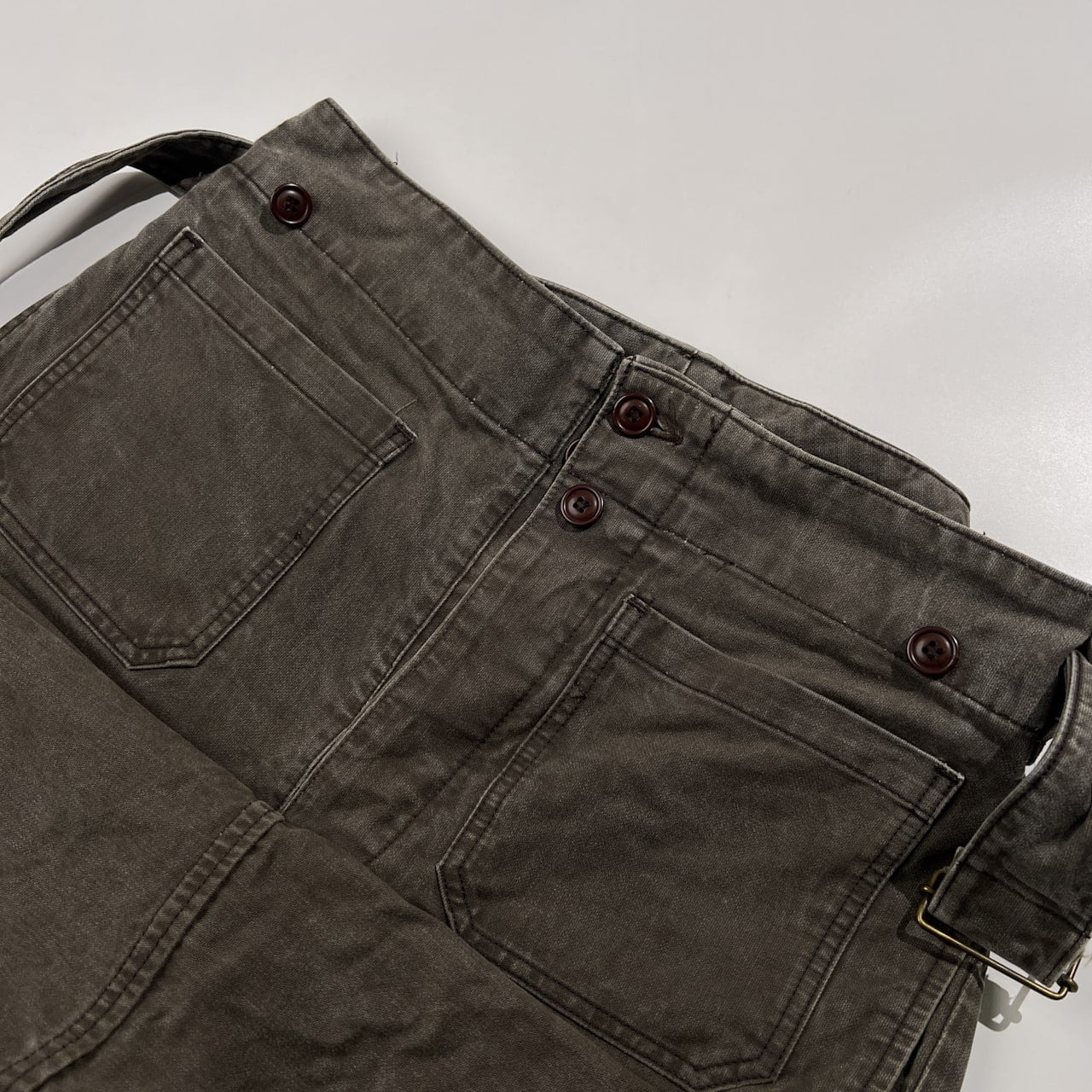 全体的に加工が施されています。味のある使用感、アタリ、ヨゴレがありますが、商品状態は良好です。裾のベルト金具が欠損しています。コンデションについての詳細は画像をご参照ください。