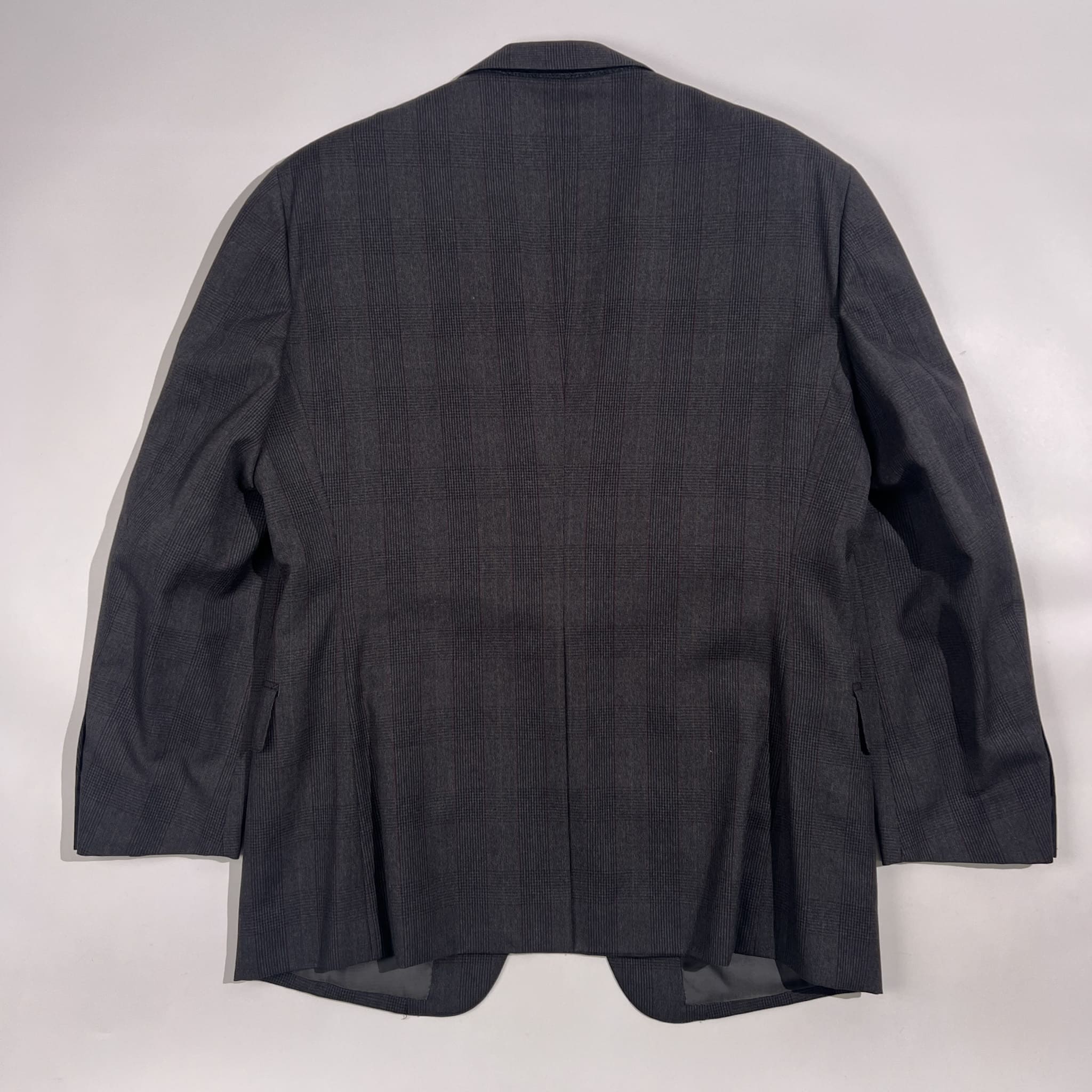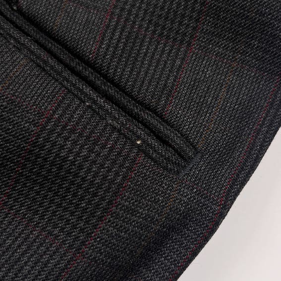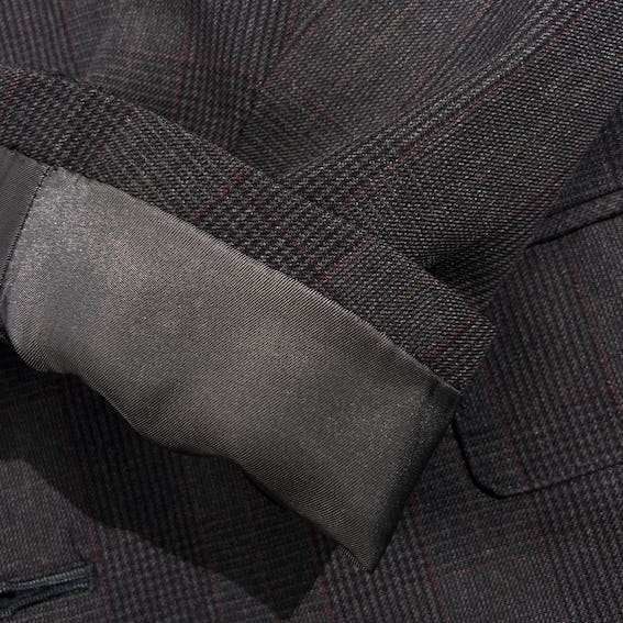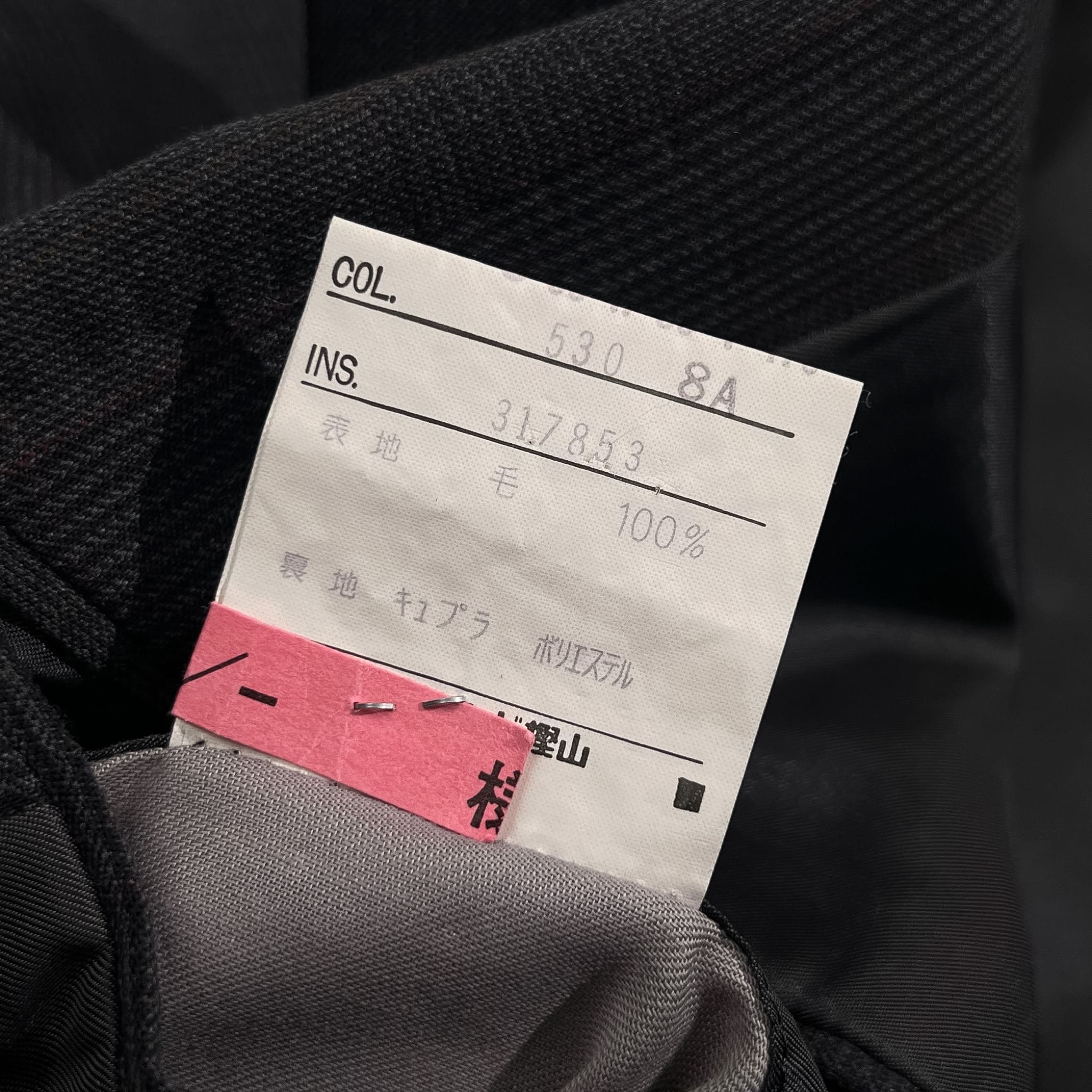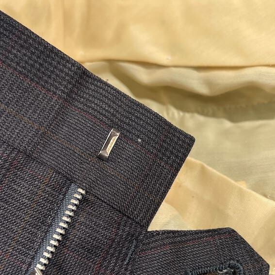 裏地にネーム刺繍入りのお品物です。ジャケットの裾先裏側によごれ、ベント部分にさけ、パンツのウエストポケットに小穴があります。コンデションについての詳細は画像をご参照ください。