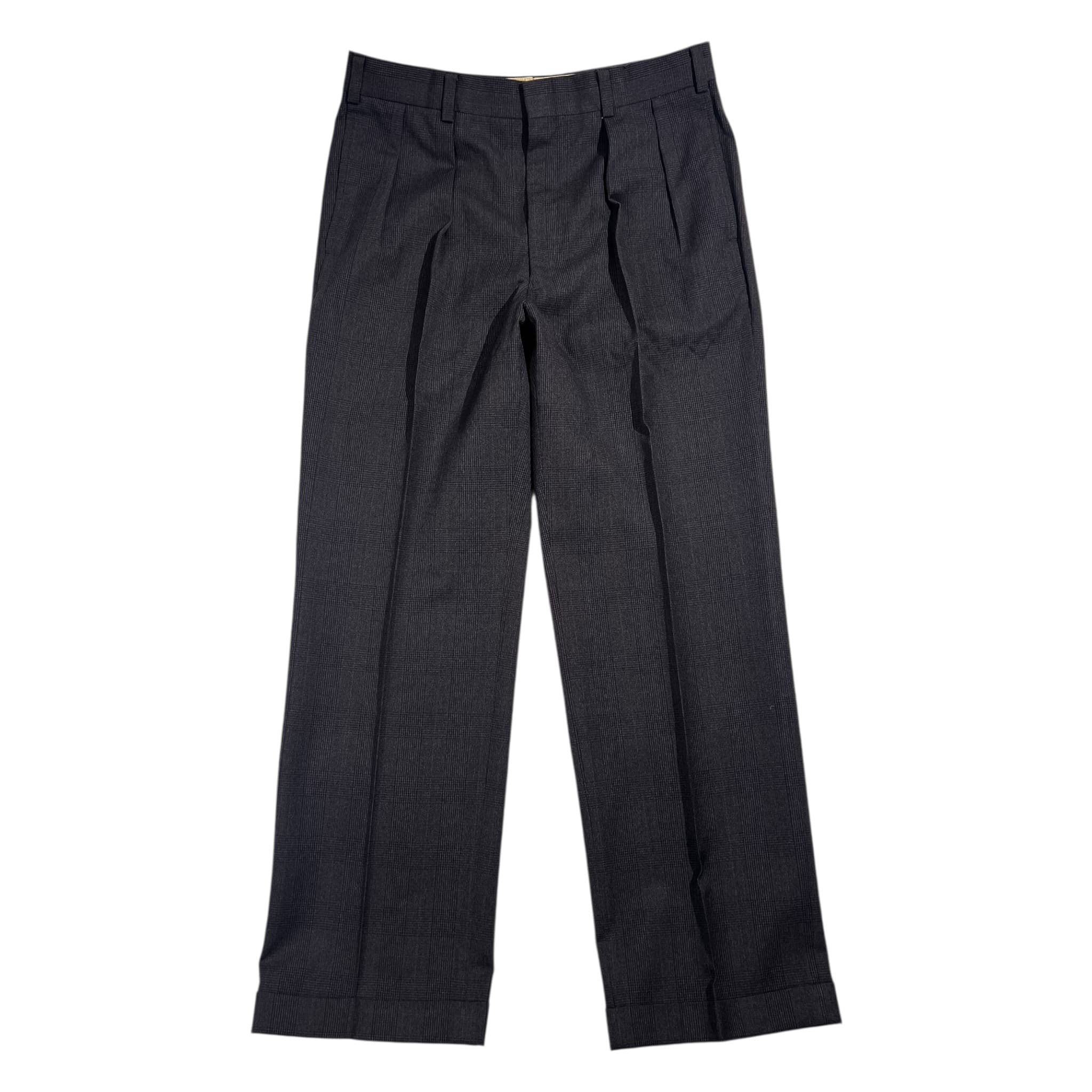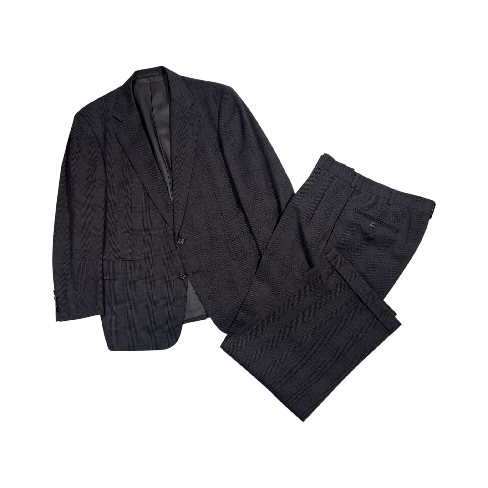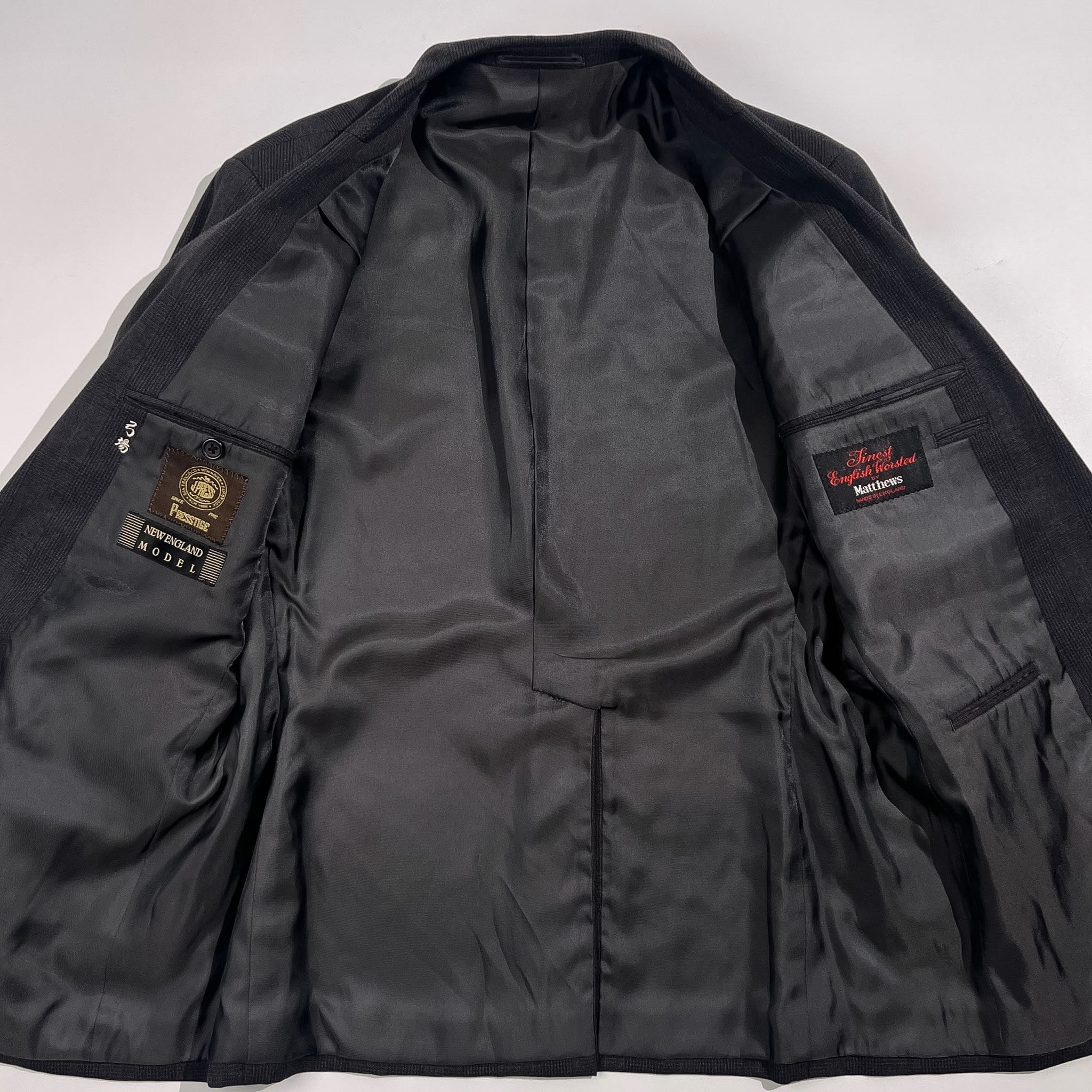 裏地にネーム刺繍入りのお品物です。ジャケットの裾先裏側によごれ、ベント部分にさけ、パンツのウエストポケットに小穴があります。コンデションについての詳細は画像をご参照ください。