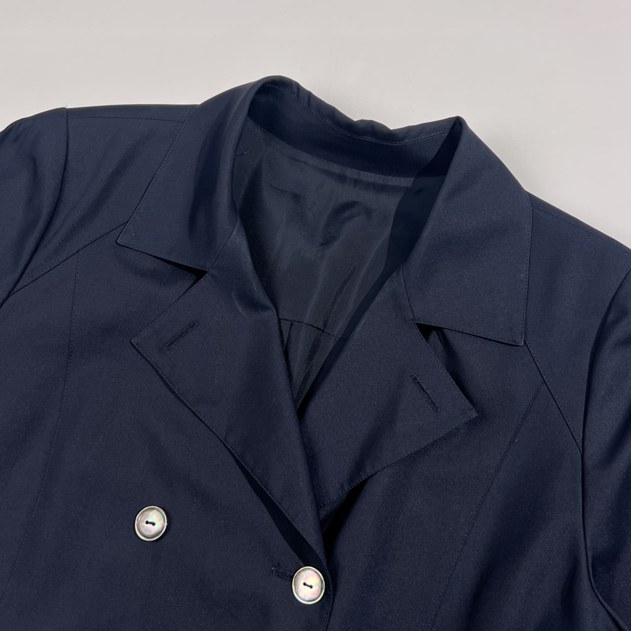 薄めの肩パッド入りのお品物です。フロント、首元にうすよごれがございますが、まだまだご着用していただけます。コンデションについての詳細は画像をご参照ください。